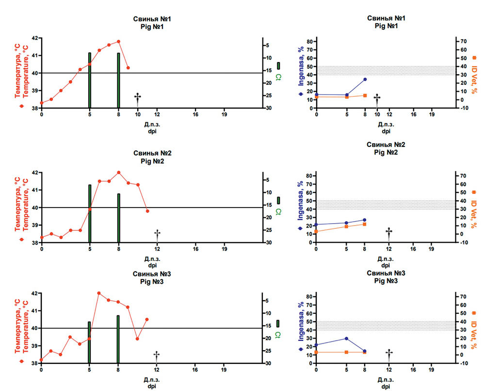 Рис. 1. Показатели термометрии и результаты исследования проб крови зараженных свиней (№№ 1–3) методами ПЦР-РВ и ТФ-ИФА (n = 3). † – даты падежа; горизонтальной линией по оси ординат отмечена граница физиологической нормы температуры (40,0 °С); столбцы показывают значение Ct при постановке ПЦР-РВ.