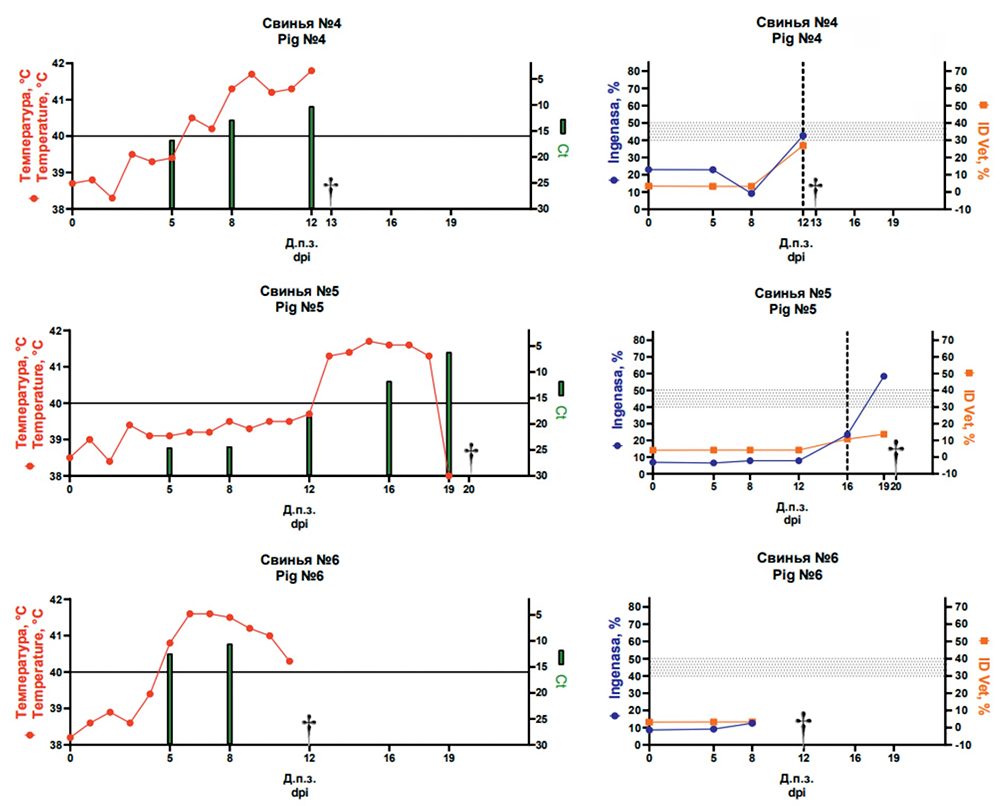 Рис. 2. Показатели термометрии и результаты исследования проб крови зараженных свиней (№№ 4–6) методами ПЦР-РВ, ТФ-ИФА и ИПМ (n = 3). † – даты падежа; горизонтальной линией по оси ординат отмечена граница физиологической нормы температуры (40,0 °С); столбцы показывают значение Ct при постановке ПЦР-РВ; вертикальными пунктирными линиями отмечены даты первого положительного результата в ИПМ.