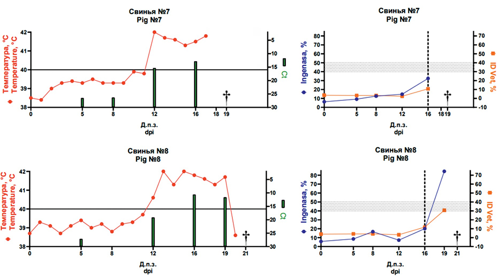 Рис. 3. Показатели термометрии и результаты исследования проб крови контактных свиней (№№ 7, 8) методами ПЦР-РВ, ТФ-ИФА и ИПМ (n = 3). † – даты падежа; горизонтальной линией по оси ординат отмечена граница физиологической нормы температуры (40,0 °С); столбцы показывают значение Ct при постановке ПЦР-РВ; вертикальными пунктирными линиями отмечены даты первого положительного результата в ИПМ.