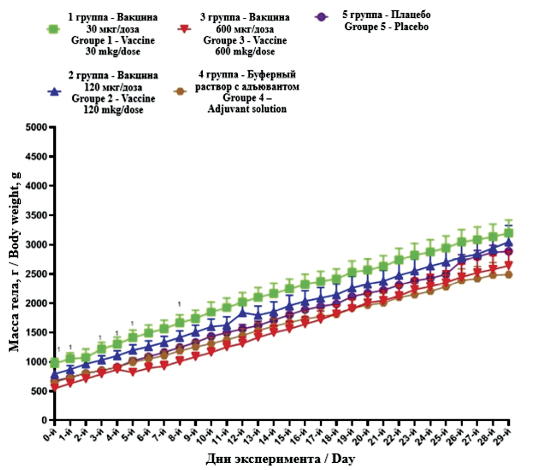 Общее состояние животных на протяжении всего периода иммунизации соответствовало норме. Динамика массы тела как интегральный показатель здоровья животных на протяжении всего периода иммунизации во всех группах была положительной (рис. 1).