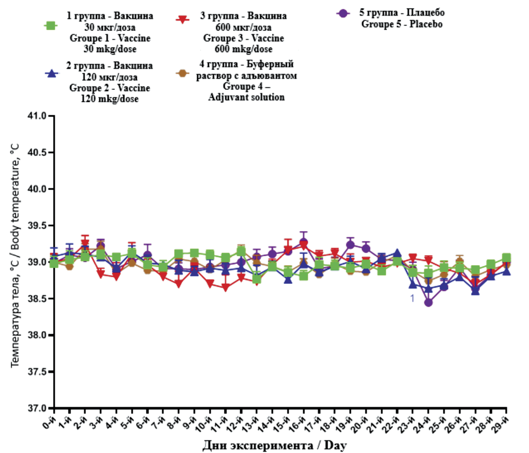 Безопасность тестируемой вакцины оценивали на основании данных термометрии, клинического осмотра, динамики массы тела, клинических и биохимических показателей крови, а также некропсии и гистологического исследования животных. Регистрацию массы тела, термометрию и клинический осмотр проводили ежедневно на протяжении всего эксперимента