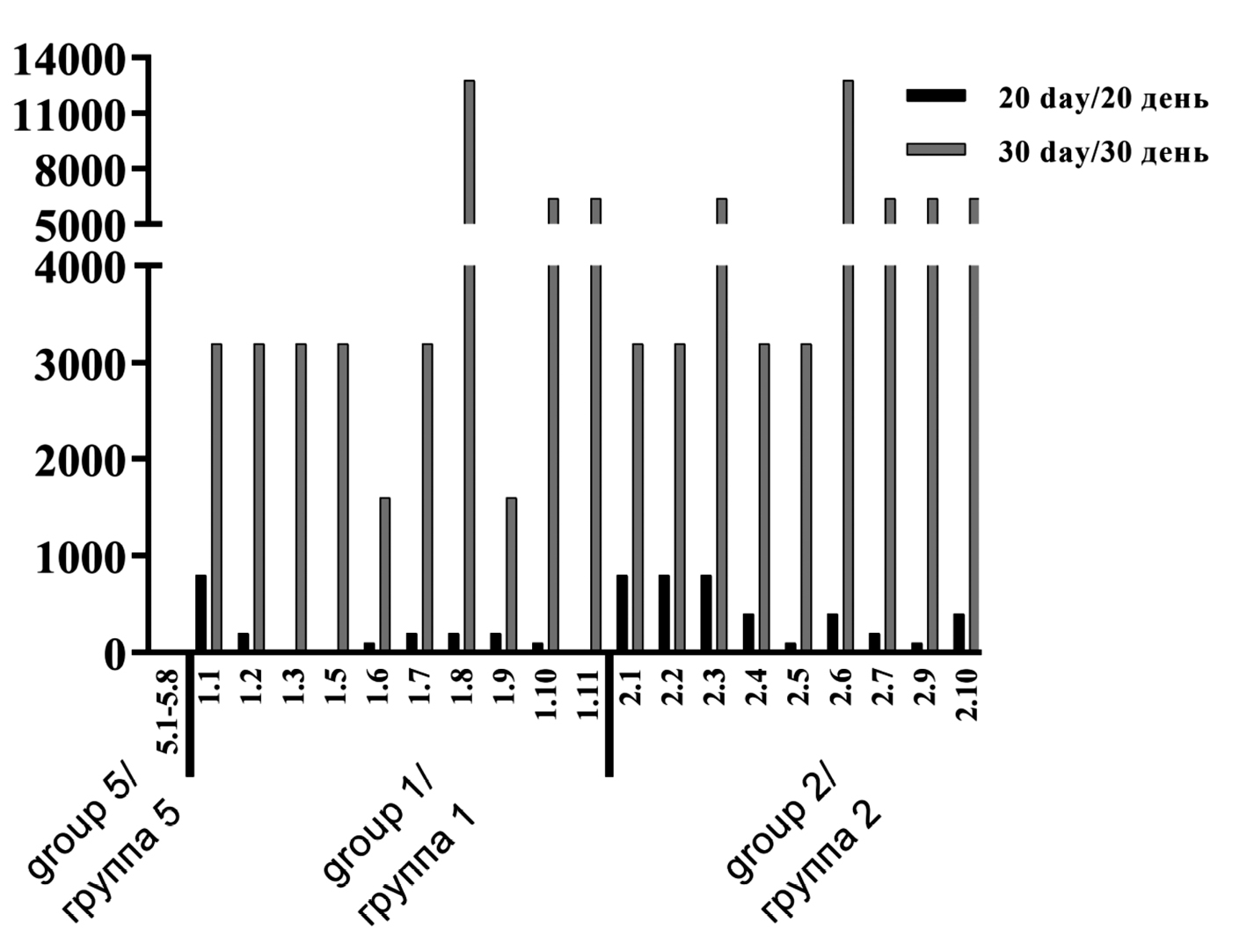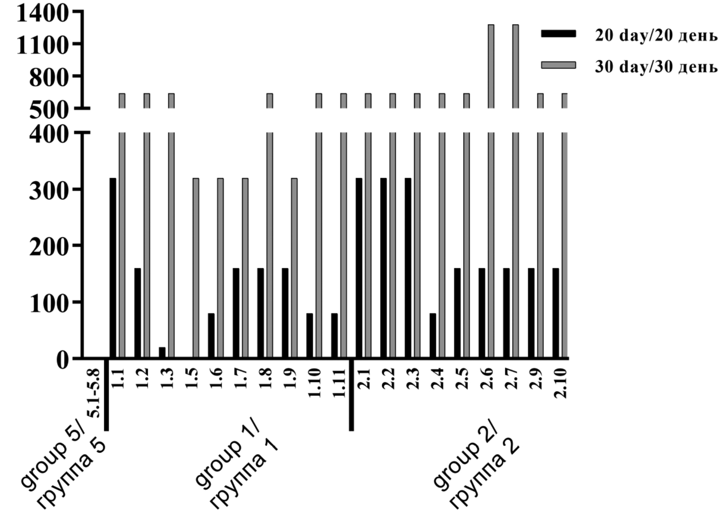 Fig. 4. Titers of neutralizing antibodies to rotavirus A in the blood serum of newborn pigs vaccinated three times. The X-axis indicates the groups. The Y-axis shows the reciprocal values of serum antibody titers. GM (95% CI) on the 20th day of immunization – 108.9 (59.6–198.8) and 186.6 (130.8–266.3), on the 30th day of immunization – 485.0 (375.5–626.6) and 746.6 (590.3–944.2) in 1st and 2nd groups, respectively.