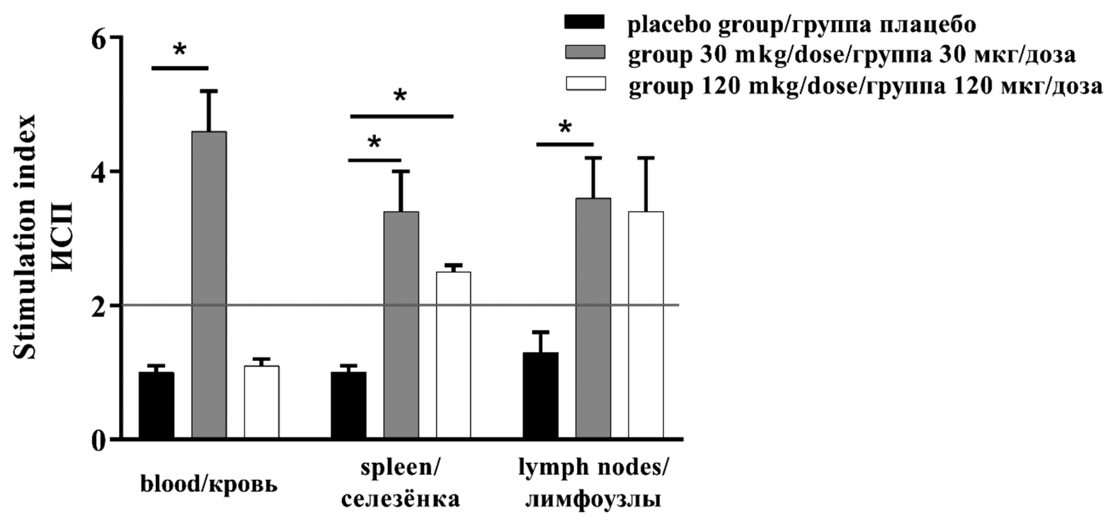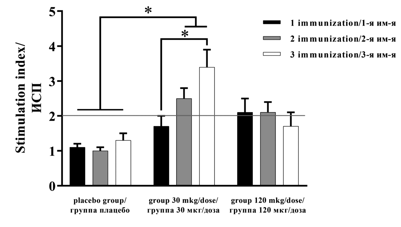 У животных, иммунизированных вакциной в дозах 30, 120 мкг, и группы плацебо на 10-е сутки после 1-й и 2-й иммунизации отбирали периферическую кровь, после 3-й – периферическую кровь, селезенку и брыжеечные лимфатические узлы, выделяли фракцию мононуклеарных клеток [15]. Мононуклеары крови, селезенки и брыжеечных лимфатических узлов помещали в 96-луночные культуральные панели в концентрации 105 клеток в лунку. Антигены-стимуляторы добавляли по 100 мкл в лунку к клеткам до конечных концентраций. Клетки культивировали в полноростовой среде RPMI-1640, с 20% эмбриональной телячьей сывороткой (2 мМ глутамина, 4,5 г/л глюкозы, 50 мкг/мл гентамицина, 0,2 ед/мл инсулина) при 37 °С в атмосфере 5% СО2. Все манипуляции выполняли в стерильных условиях.