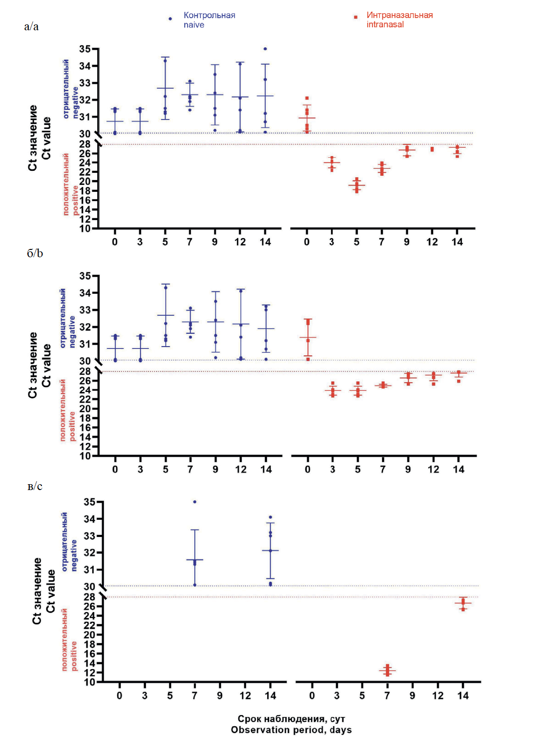 В настоящей работе с помощью методов молекулярно-генетического анализа было проведено ПЦР-исследование на выявление вирусных РНК в образцах, полученных от подопытных животных. ПЦР-исследование в реальном времени показало наличие вирусных РНК в образцах, взятых из носовых и оральных смывов на 3-и и 14-е сутки, а также из тканях легких, отобранных на 7-е и 14-е сутки. Полученные ПЦР-результаты указывают на успешную репликацию вируса на данных моделях в эксперименте, что согласуется с сообщениями других исследователей [18].