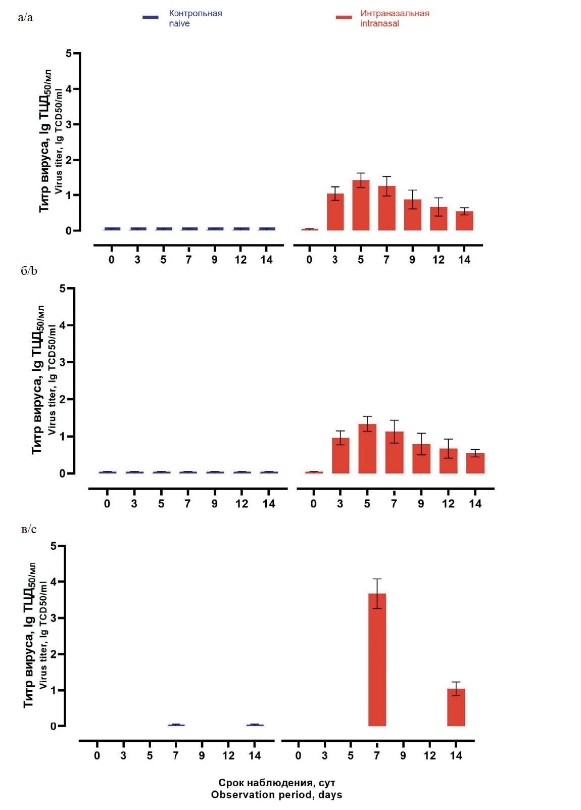 Результаты исследования вирусовыделения из ткани легких, проведенное на 7-е и 14-е сутки (рис. 7), выявило у зараженных интраназальным методом хомяков содержание вируса с титром 3,66 ± 0,41 lg ТЦД50/мл (на 7-е сутки) и 1,04 ± 0,19 lg ТЦД50/мл (на 14-е сутки).