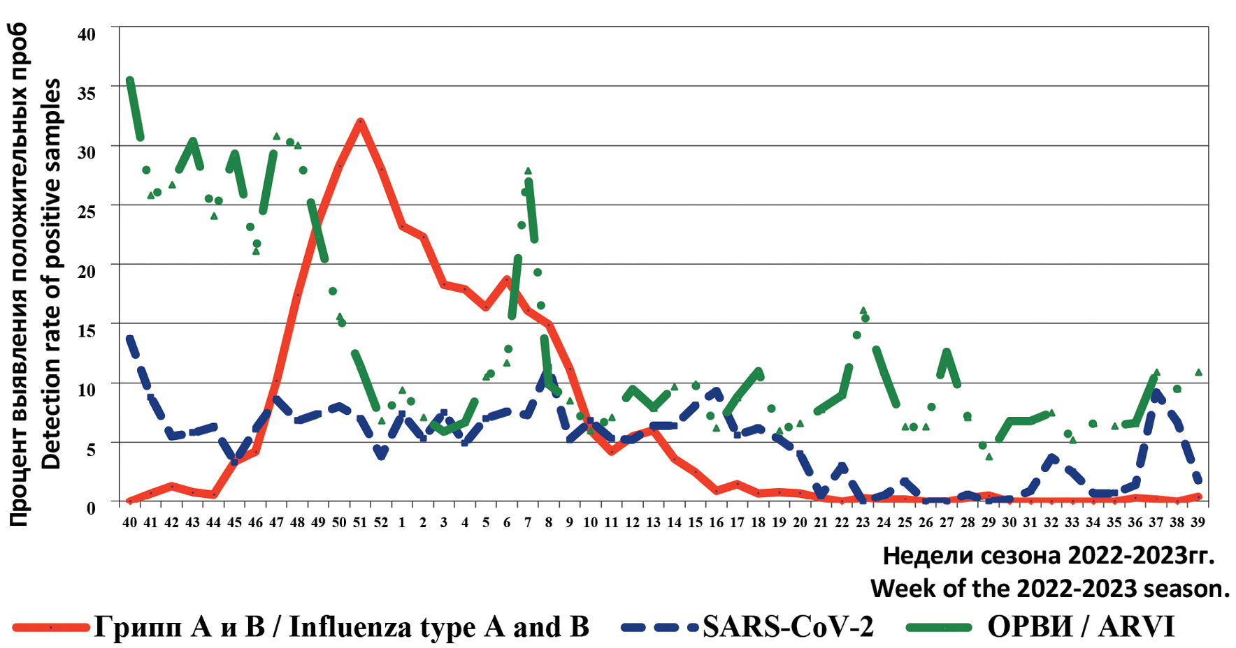 The 2022–2023 epidemic season started with a relatively high rate of positive samples for ARVI of non-influenza etiology (40th weeks 2022 – 35.5%). At the same time, during this period the frequency of positive samples for SARS-CoV-2 was significantly lower (13.7%), and influenza viruses were not detected.