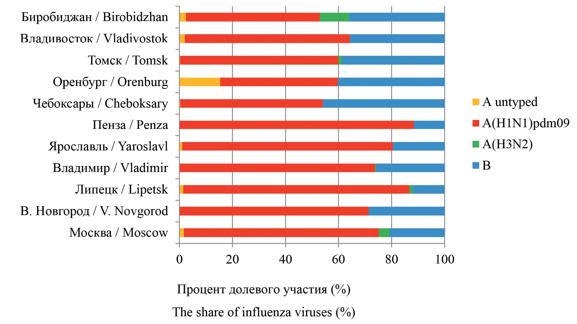 Fig. 2. The share of influenza viruses during the epidemic season 2022–2023 in different regions of the Russian Federation (according to the Centers of Hygiene and Epidemiology of cities, regions, republics).