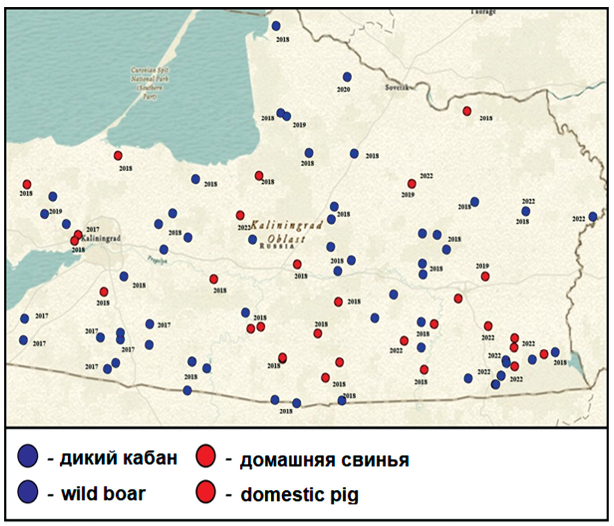 Materials and methods. Blood samples from living domestic pigs and organs from dead domestic pigs and wild boars, collected in the Kaliningrad region between 2017 and 2022 were used. Virus isolation was carried out in porcine bone-marrow primary cell culture. Amplicons of genome markers were amplified by PCR with electrophoretic detection and subsequent extraction of fragments from agarose gel. Sequencing was performed using the Sanger method.
