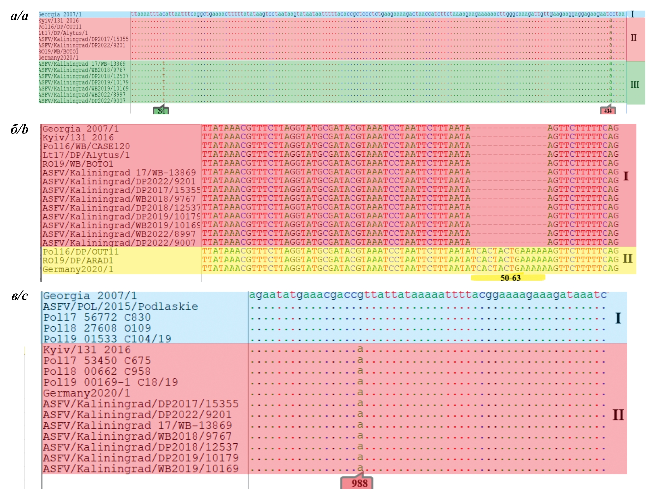 Рис. 2. Множественное нуклеотидное выравнивание маркерных фрагментов генов K145R (а), O174L (б) и MGF 505-5R (в) изолятов вируса АЧС, полученных при секвенировании по методу Сэнгера.