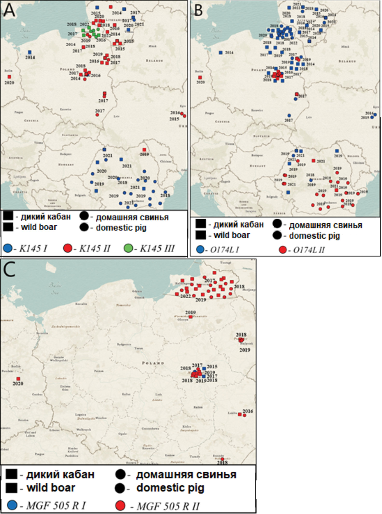 Previously presented data show that the formation of the genetic cluster K145R-II, MGF 505-5R-II, MGF 110-7L-II began in 2016 in Ukraine and Poland [19, 20]. The spatio-temporal array of this cluster is observed from 2016 to 2020 in Poland, from July 2017 to March 2022 in Lithuania. In parallel, an O174L-II variant with an insertion in the gene of the same name was registered in Poland in 2016, which always corresponds to MGF 505-5R-II [21, 22]. At the same time, O174L-II is combined with K145R-II in some cases (2016–2020) and with K145R-I in others (2018–2019). However, O174L-II has not been reported in Lithuania, Ukraine and the Kaliningrad region [1, 11, 20]. 19 ASF outbreaks in Romania (2019) correspond to the O174L-II, K145R-I group, and only one isolate 6 km from the Ukrainian border was categorized as K145R-II and O174L-I [1]. Further, similar changes in the genome (O174L-II, K145R-II) were observed in the ASFV isolate isolated from wild boar in Germany (2020) [2].