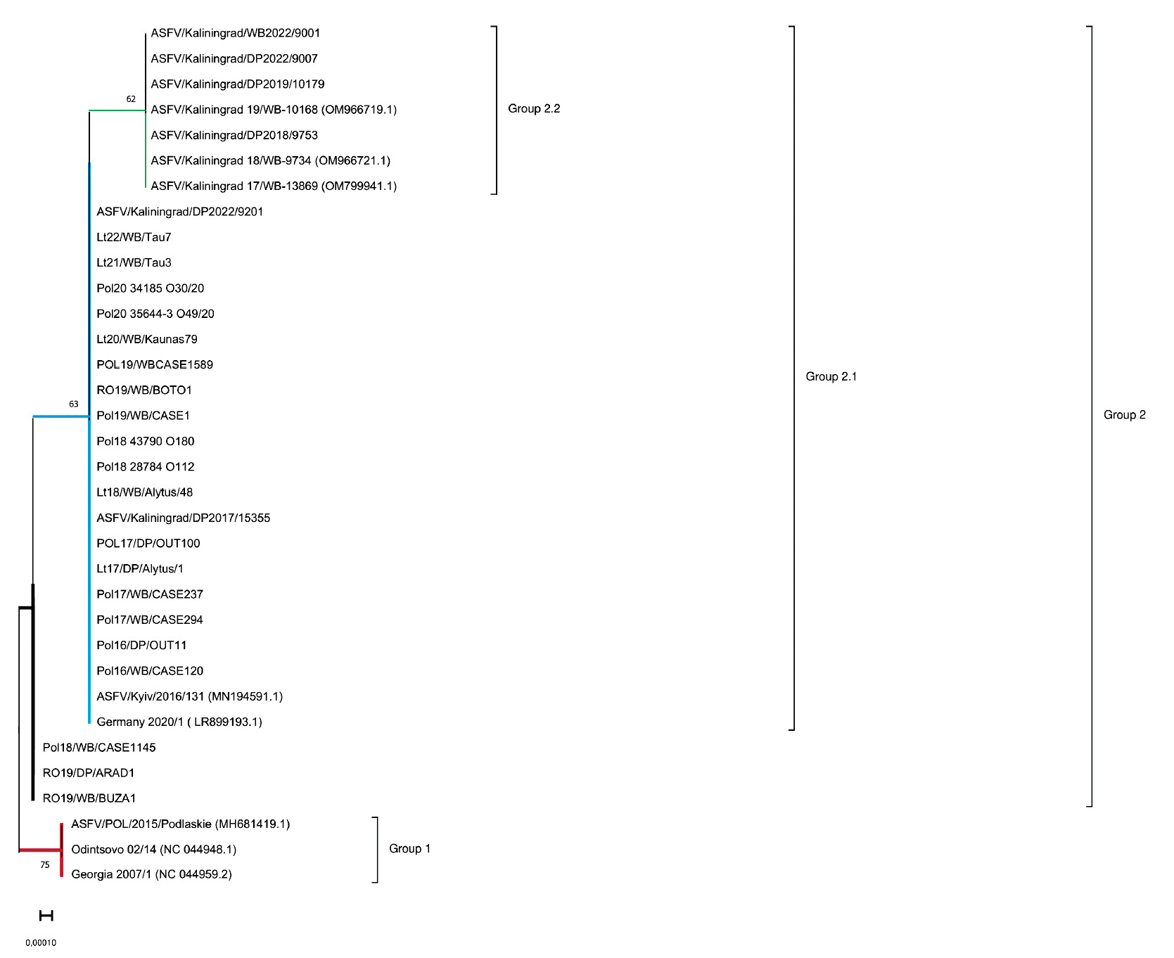 As shown in Figure 4, two groups within genotype II were identified. Group 1 is completely homologous to strain Georgia 2007/1. Group 2 includes 3 subgroups: group 2 proper (corresponding to genetic variants K145R-I, O174L-II); 2.1 (K145R-II, MGF 505-5R-II, O174L-I or O174L-II) and 2.2 (K145R-III, MGF 505-5R-II, O174L-I). Kaliningrad region is predominantly characterized by group 2.2 (94.3%). In Form 76, group 2.1 (5.7%) was registered.
