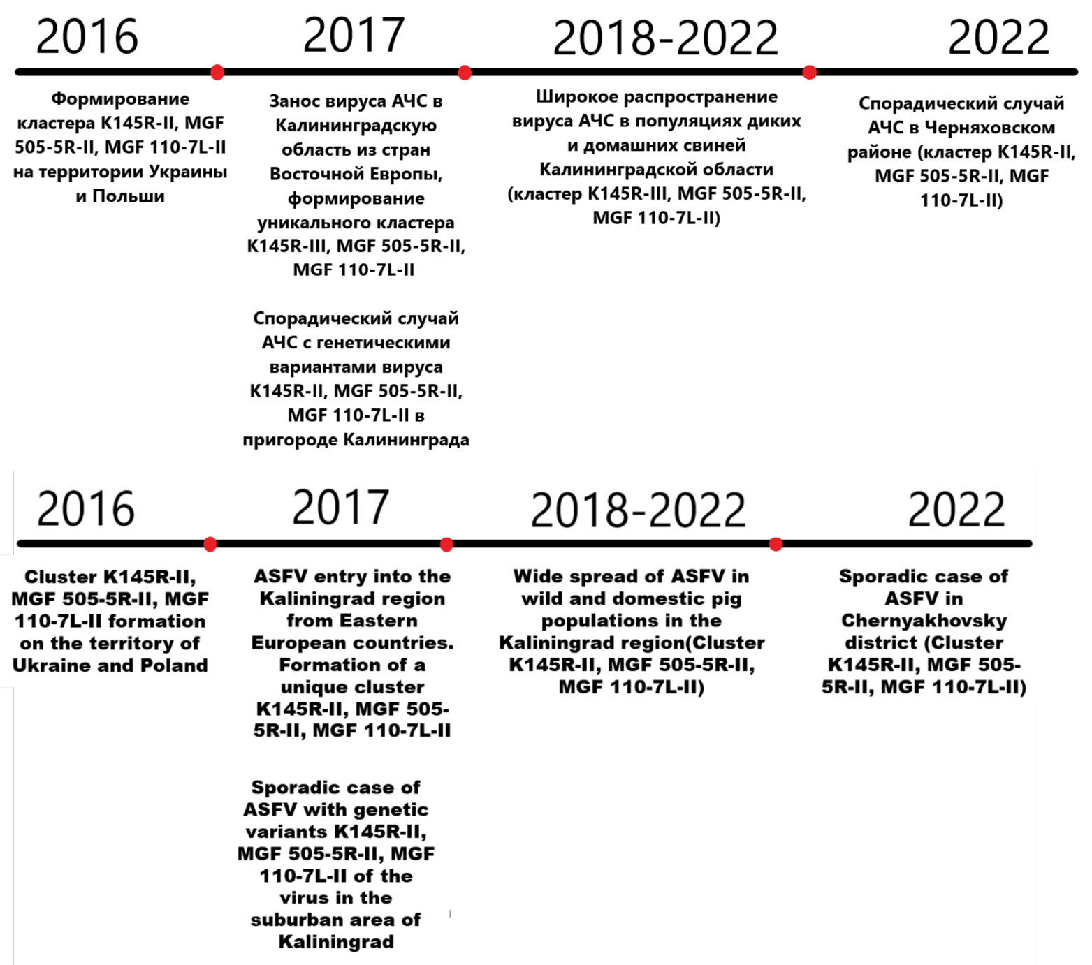 After a prolonged absence of virus with K145R-II (2018–2021) in the Kaliningrad region, an isolate of ASFV/Kaliningrad/DP2022/9201 was isolated in 2022 at a large pig breeding farm in the village of Pokrovskoye, Chernyakhovsky district, belonging to this variant. However, K145R-II has never been detected in infected wild boars in the region, which are one of the characteristic factors in the spread of ASFV, including the 2022 isolates [27–31]. However, the disease was registered during the second half of 2022 in Lithuania/Poland/Ukraine, and the genetic sequence of the pathogen in individual countries (Lithuania) corresponded to K145R-II and O174L-I2 [1, 32].