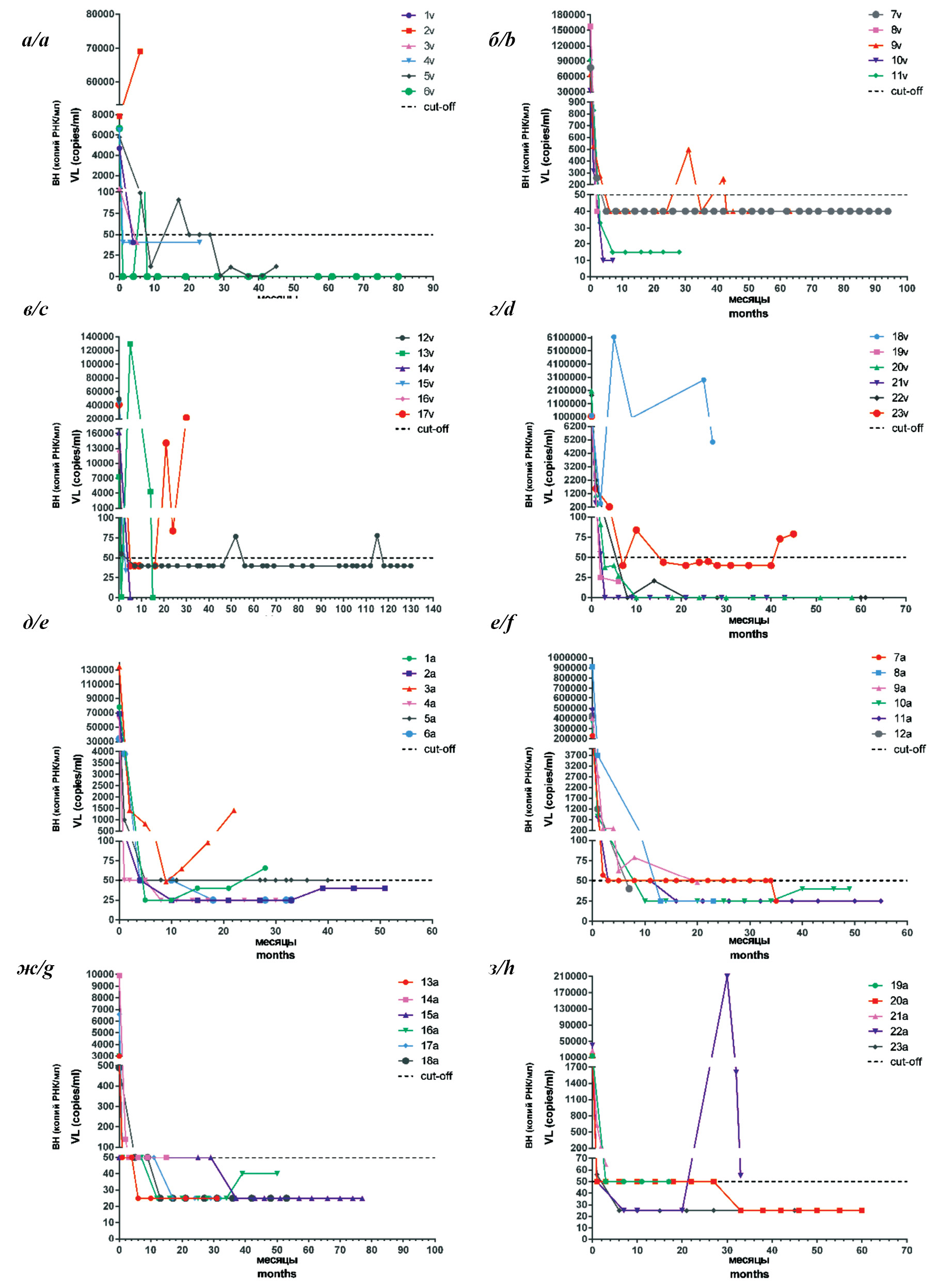 Уровень ВН ниже 50 копий/мл определялся как пороговый. a–г (группа A62V+): а – пациенты 1v, 2v, 3v, 4v, 5v, 6v; б – пациенты 7v, 8v, 9v, 10v, 11v; в – пациенты 12v, 13v, 14v, 15v, 16v, 17v; г – пациенты 18v, 19v, 20v, 21v, 22v, 23v; д–з (группа А62V−): д – пациенты 1а, 2а, 3а, 4а, 5а, 6а; е – пациенты 7а, 8а, 9а, 10а, 11а; ж – пациенты 12а, 13а, 14а, 15а, 16а, 17а; з – пациенты 18а, 19а, 20а, 21а, 22а, 23а.