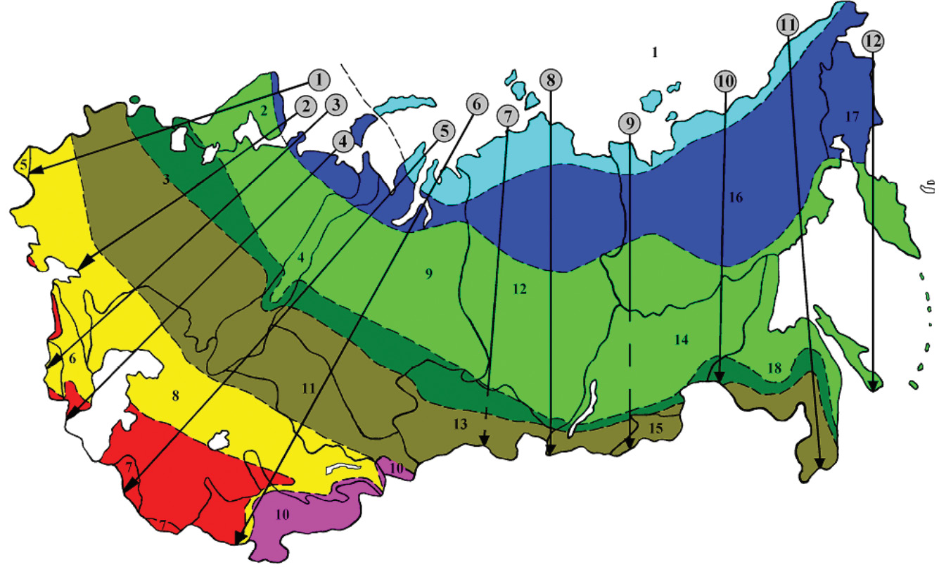 Fig. 6. Meridional sounding of the USSR territory – studies on identification of biological viral background similar to radiation and landscape-climatic zoning.