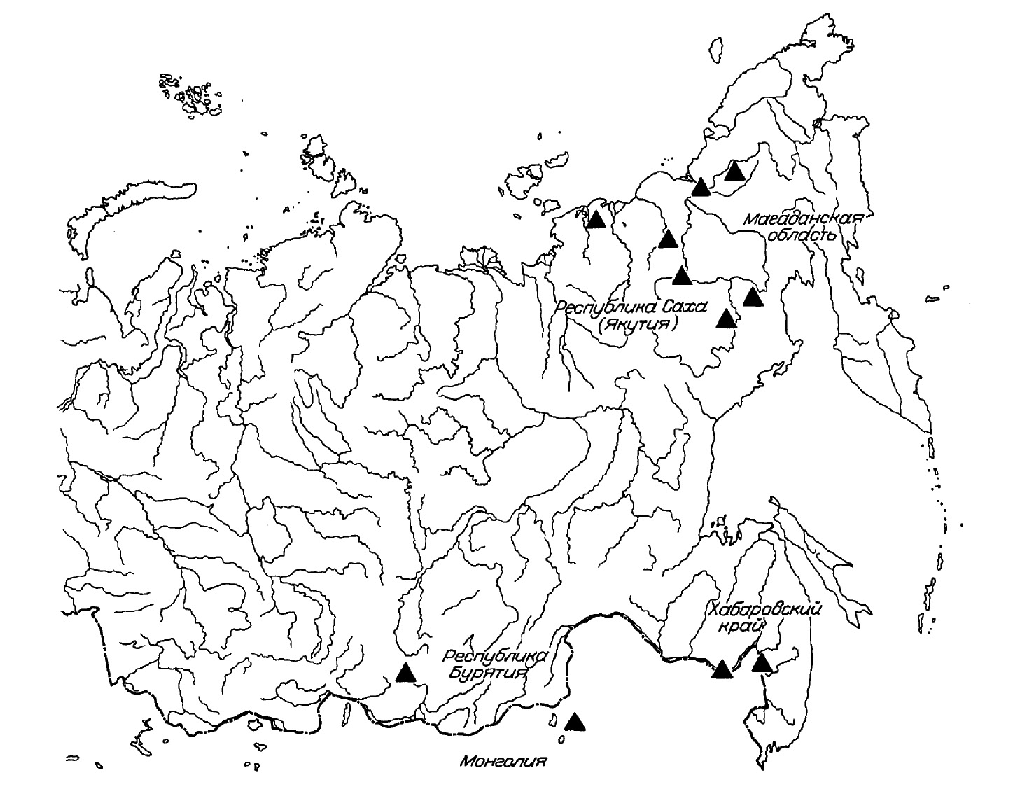 Рис. 9. Места изоляции вируса Гета (Togaviridae: Alphavirus) в Восточной Сибири, на Дальнем Востоке, Монголии.