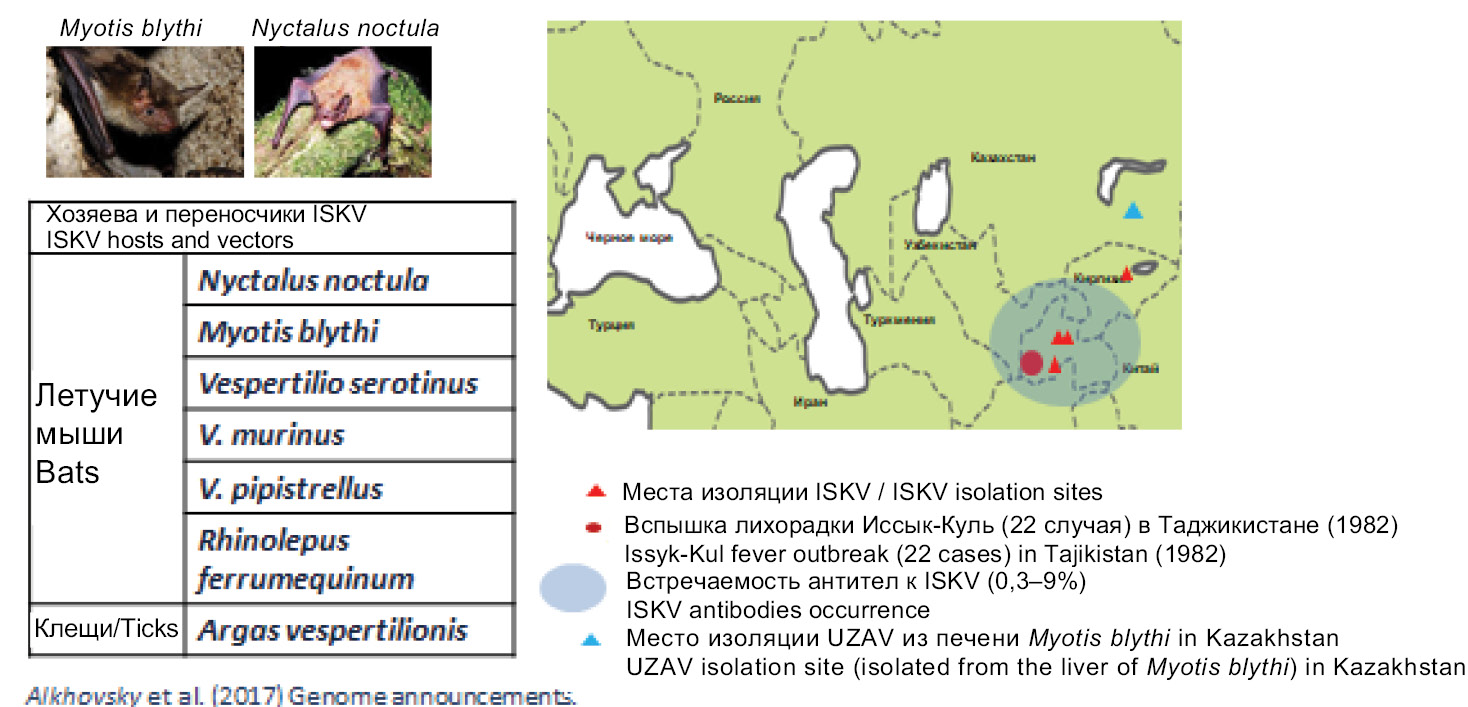 New viruses were discovered during surveillance in Central Asia and Transcaucasia. Issyk-Kul fever virus (Nairoviridae: Orhonairoviruses) associated with bats and their argas ticks was described for the first time (Figure 10). New viruses of Tamda and Burana fevers (Nairoviridae: Orthonairovirus), Syrdarya fever (Picornaviridae: Cardiovirus) were isolated from ixodal ticks collected from goats and cows in desert biocenoses. Several new viruses (Artashat, Chim, Geranium) were isolated for the first time from argas ticks collected from rodent burrows. The above viruses were classified as different species of the Orthonairovirus genus of the Nairoviridae family. Karshi virus (Flaviviridae: Flavivirus), related to Royal Farm virus (Afghanistan), isolated for the first time from argas ticks, belongs to the TBE (tick-borne encephalitis) complex and causes sporadic cases of febrile illness in humans. A new flavivirus, Sokuluk, ecologically related to bats and related to Entebbe bat virus from Africa, was isolated for the first time in Central Asia. In Kyrgyzstan, a new Tyulek virus, later assigned to the Qaranjavirus genus of the Orthomyxoviridae family, was isolated from argas ticks collected in nesting burrows of birds.