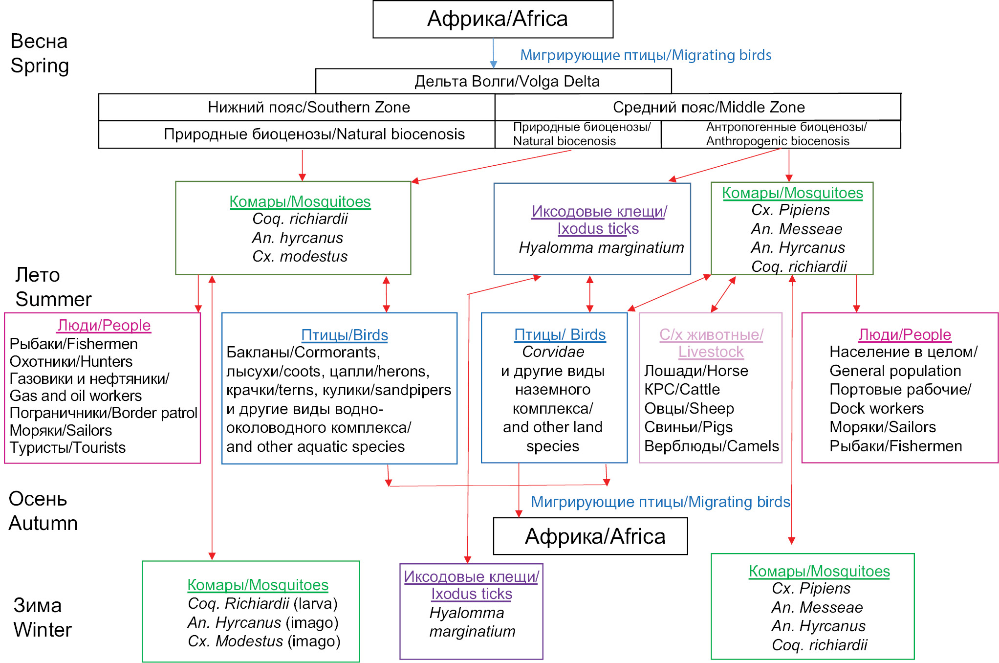 Рис. 13. Популяционные взаимодействия вируса Западного Нила с членистоногими переносчиками и позвоночными хозяевами.