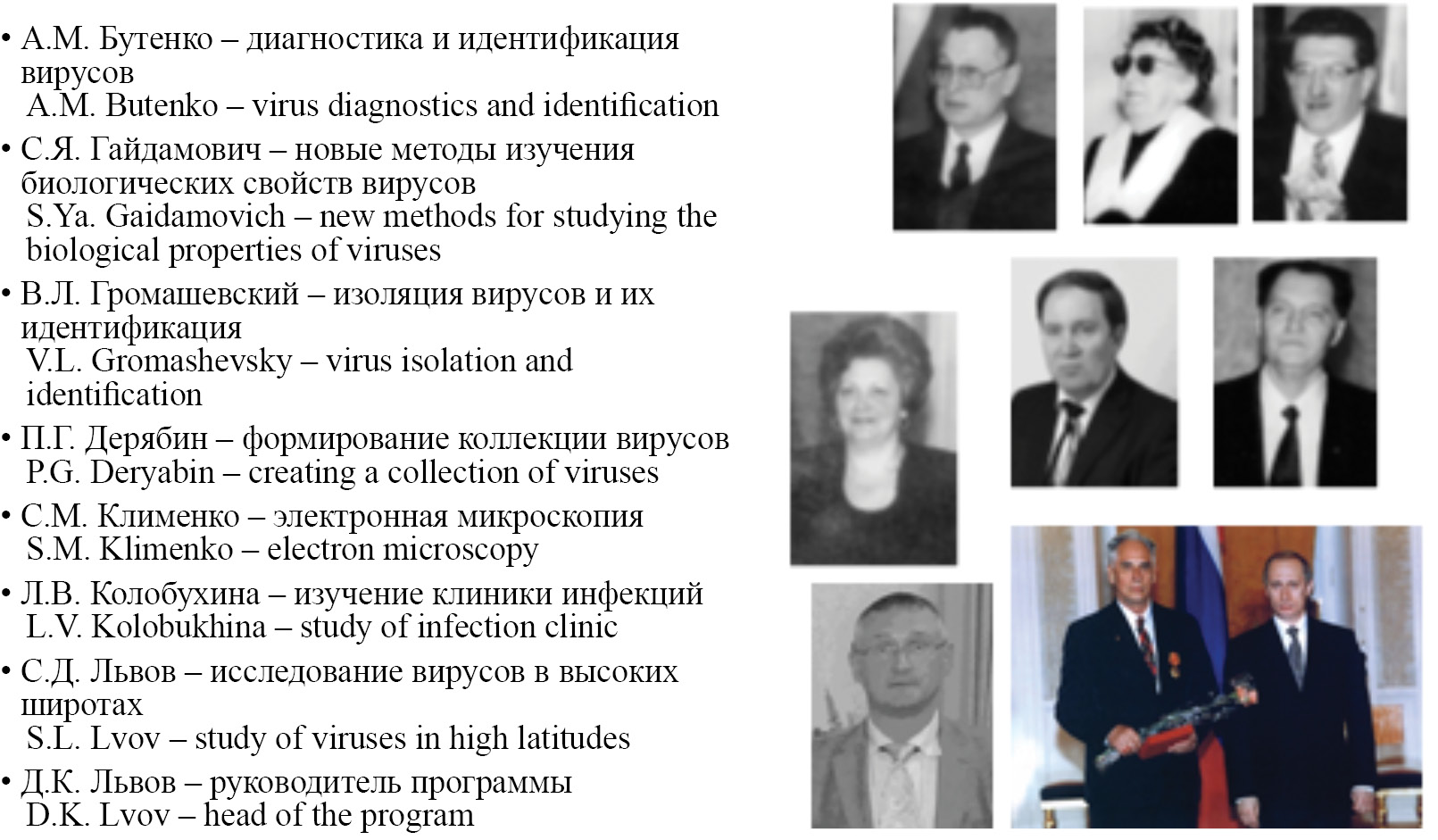 The VED consisted of first-class medical and biological specialists: virologists and biologists with vast experience in laboratory, zoological and arachno-entomological field studies in natural foci of infections. The staff of the related laboratories of the IV departments: Clinical Virology, State Collection of Viruses, Applied Virology and Immunology, Arboviruses and Molecular Virology actively participated in the complex research. In the course of its work, the Division cooperated closely with the N.F. Gamaleya Institute of Epidemiology and Microbiology of the Russian AMS, M.M. Shemyakin and Yu.A. Ovchinnikov Bioorganic Chemistry of the RAS, M.R. Kovalenko All-Russian Research Institute of Experimental Veterinary Science of the RAS. Furthermore, a number of studies were carried out at the Russian Antiplague Scientific Research Institute Microbe of Rospotrebnadzor, the V.A. Engelberg Molecular Biology Institute of the RAS, the M.M. Shemyakin and Yu.A. Ovchinnikov Russian Research Institute of Experimental Veterinary Medicine, V.A. Engelhardt Molecular Biology Institute of the RAS, the Central Research Institute of Epidemiology of Rospotrebnadzor, the A.N. Severtsev Problems of Ecology and Evolution of the RAS and other institutions of both sanitary-epidemiological and veterinary services of the Soviet Union and the Russian Federation.