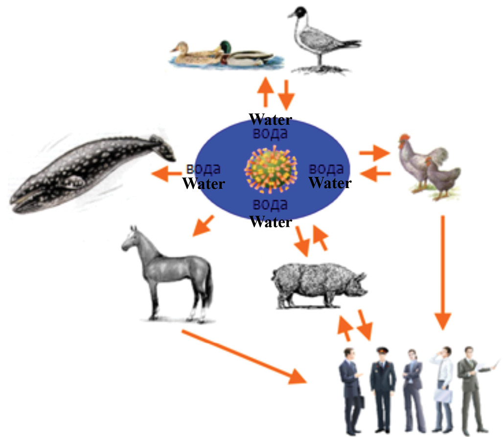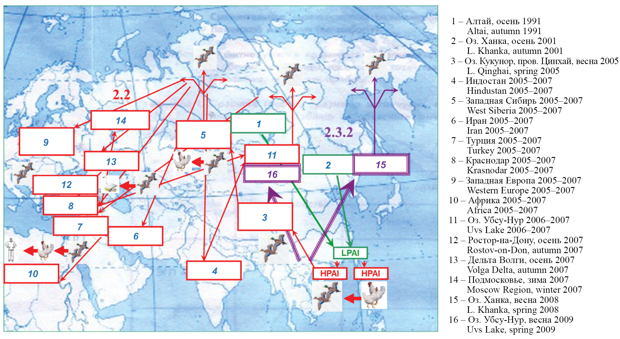 Much attention was paid to the study of various aspects of the ecology and epidemiology of influenza. Based on the results of these studies, the leading role of birds in the evolution of influenza A viruses were revealed, which allows us to consider influenza A as a reverse zoonosis (Figures 15, 16). Active circulation of 15 of 18 subtypes of influenza A virus (Orthomyxoviridae: Alphainfluenzavirus) known in the world in natural biocenoses of Northern Eurasia, including genetic variants that are considered as possible precursors of new pandemic viruses (Figure 17) [31–34], has been established. The causes and consequences of the avian influenza H5N1 entry into Northern Eurasia and the global consequences of this process were studied (Figure 18). One of the isolated strains was used for the production of avian influenza vaccine (FLU PROTECT H5) [35–39].