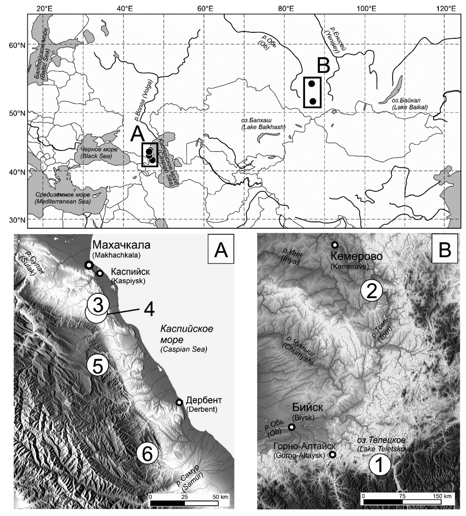 A – capture points in the North Caucasus: 4 – Bolshaya Glinyanaya cave, 3 – Karabudakhkentskaya cave, 5 – adits near the village Khantskarkamahi, 6 – cave near the village of Kug; B – capture points in the south of Western Siberia: 1 – Artybash, 2 – Azhendarovo tract.