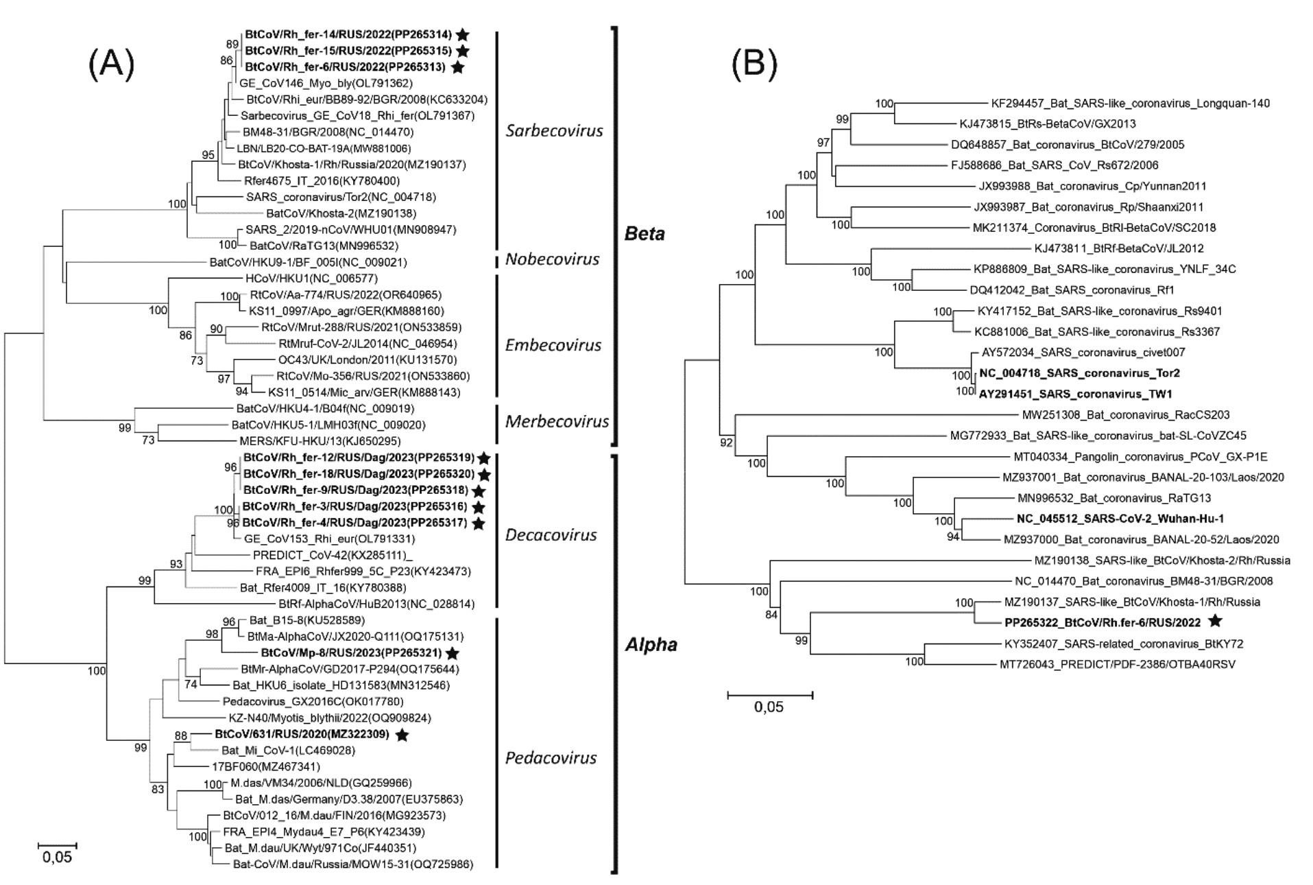 Epidemiologic studies on the detection of coronaviruses in natural reservoirs and their typing in Russia began during the COVID-19 pandemic. In 2020, SARS-like coronaviruses were discovered in two species of Horseshoe bats (RNA isolates Khosta-1 from Rh. ferrumequinum and Khosta-2 from Rh. hipposideros) in the Krasnodar region of the Russian Federation and their full-length genomes were studied [17]. The level of similarity of Russian isolates was 76–78% with SARS-CoV and SARS-CoV-2 strains from China and was highest (89%) with the European strain BM48-31/BGR/2008 from Bulgaria for Khosta-1 and with the African strain BtKY72 (80%) for Khosta-2. A MERS-like coronavirus was detected among smooth-nosed Pipistrellus nathusii (isolate MOW-BatCoV/15-22) in the central part of European Russia [21]. The level of similarity of the Russian isolate with MERS pathogens was 81–82%. To date, no studies of coronaviruses among bats in the North Caucasus and the Asian part of the country have been conducted. The study revealed circulation of two coronaviruses in Dagestan, belonging to the Sarbecovirus subgenus of the Betacoronavirus genus and the Decacovirus subgenus of the Alphacoronavirus genus. Coronaviruses belonging to the Pedacovirus subgenus of the Alphacoronavirus genus were detected in the south of Western Siberia.