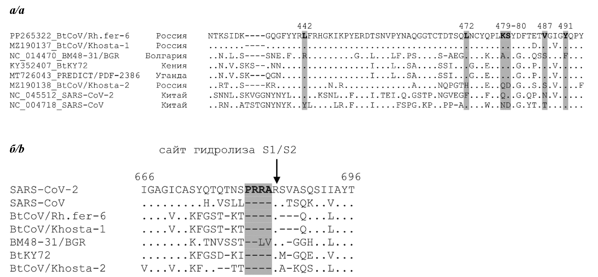 Шесть позиций (442, 472, 479, 480, 487, 491; нумерация по штамму AY278741), важных для адаптации SARS-CoV-подобных вирусов к рецептору человека ACE2 [24], выделены жирным шрифтом (а). Сравнение аминокислотных последовательностей, окружающих сайт гидролиза SARS-CoV-2, SARS-CoV, BtCoV/Rh.fer-6, и других SARS-CoV-подобных вирусов (б).