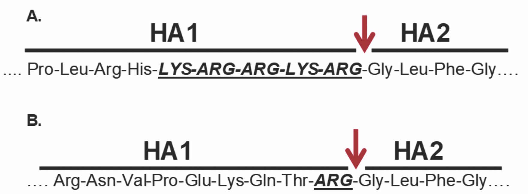 The HA protein site in the junction zone of HA1 (55 kDa) and HA2 (20 kDa) subunits formed after cleavage of the precursor molecule, HA0 (75 kDa), is shown. Low pathogenic viruses of subtypes H1–H18 contain a single arginine (Arg) residue (panel A), whereas highly pathogenic subtypes H5 and H7 have several arginine and lysine (Lys) residues present in the proteolysis site, the so-called polyarginine site of proteolysis (panel B). The polyarginine site is highly sensitive to a wide range of cellular proteases and is readily cleaved in the vast majority of target cell types [16, 33, 35–37].