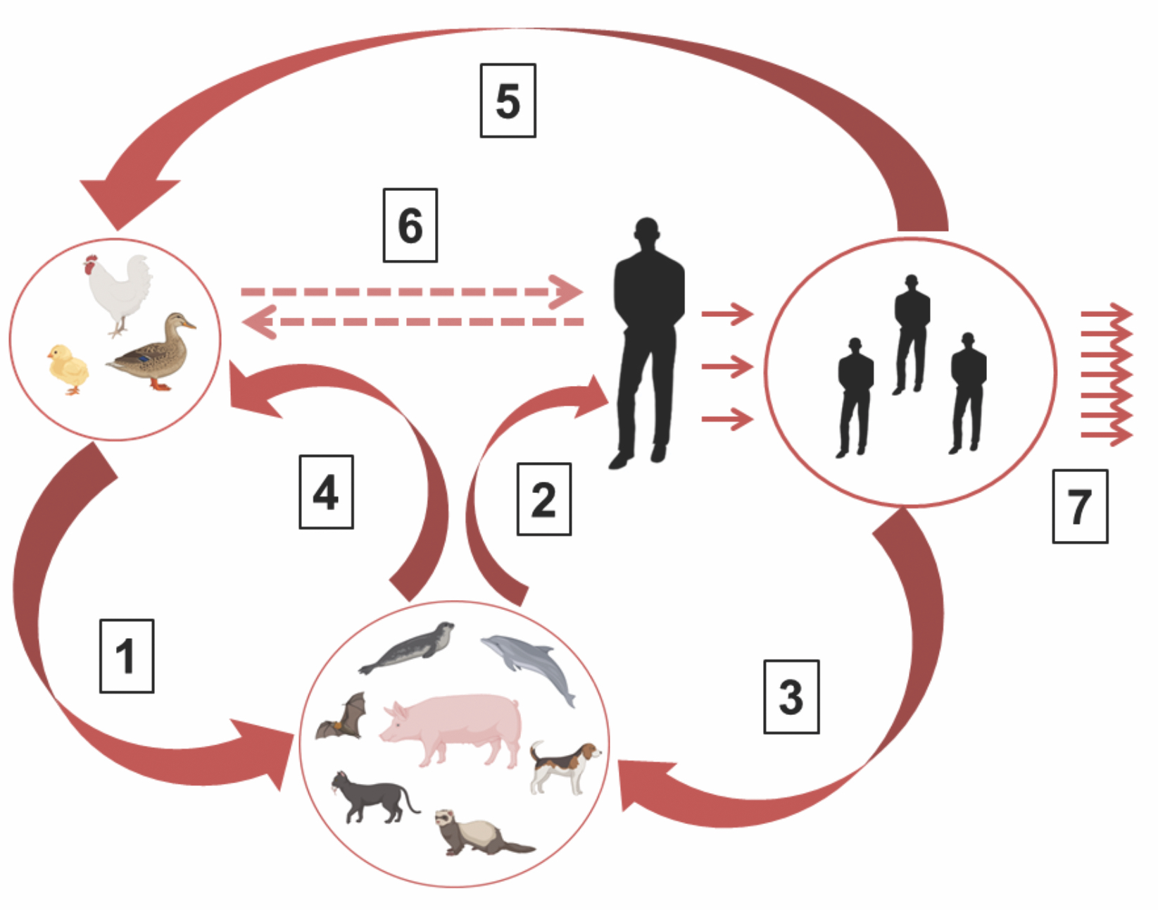 Птичий вирус гриппа H5N1 способен непосредственно переходить на человека (прямой путь передачи) или опосредованно ‒ сначала на млекопитающих животных, таких как свиньи, пушные звери, хищные звери, тюлени и др., с последующим переходом на людей (непрямой путь передачи). В организме человека и млекопитающих животных птичий вирус претерпевает частичную адаптацию к организму человека посредством адаптационных мутаций либо реассортацией сегментов вирусной геномной РНК между вирусами гриппа птиц и человека. Частично адаптированный к человеку вирус птичьего гриппа H5N1 может возвращаться в популяцию птиц и животных и формировать природный резервуар перманентной потенциальной угрозы возникновения эпидемического вируса высокопатогенного вируса человека субтипов H5 и H7. Обозначения: 1 ‒ первичная адаптация вируса гриппа к человеку (мутации в генах NP, PB2, HA, NA и др.); 2 ‒ частичная адаптация вируса к человеку; 3 ‒ поддержание межвидовой передачи вируса в биосфере; 4 ‒ передача вируса от млекопитающих птицам; 5 ‒ поддержание межвидовой передачи в биосфере; 6 ‒ прямой путь передачи инфекции от птиц к человеку и обратно; 7 ‒ развитие эпидемического процесса.