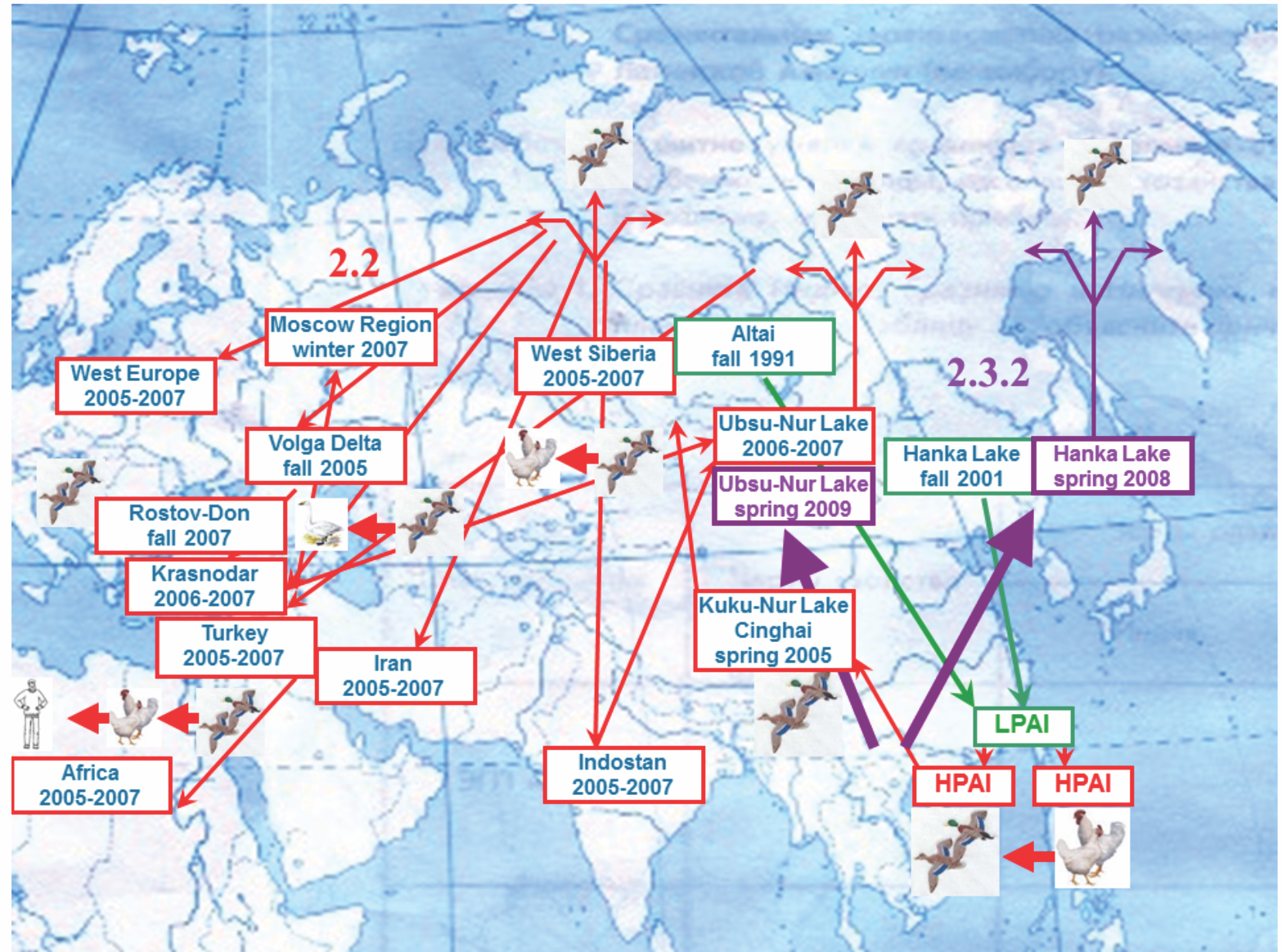 Рис. 4. Причины и последствия проникновения высоковирулентного вируса гриппа A/H5N1 в Северную Евразию (весна 2005 ‒ весна 2008) [5].
