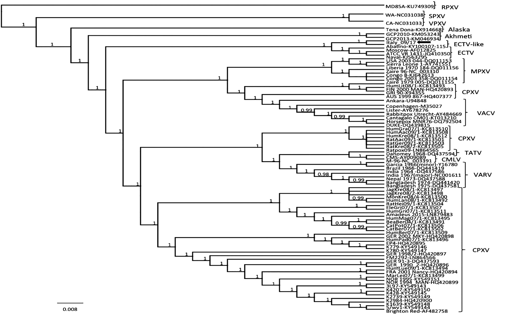 На филогенетическом дереве ортопоксвирусов штамм Италия_09/17 вируса оспы кошек формирует отдельный кластер, включающий также недавно выделенный от макак в Италии штамм Abatino. Нуклеотидная идентичность штамма Италия_09/17 и штамма Abatino составляет 99,66%, в то время как с референтными штаммами вируса эктромелии – 98,11–98,13%. По результатам анализа гена гемагглютинина, уровень идентичности штамма Италия_09/17 и штамма Abatino еще выше (99,79%) [20]. Следовательно, штаммы Италия_09/17 (выделенный от кошек) и Abatino (выделенный от макак) могут рассматриваться как штаммы одного нового ортопоксвируса Старого Света (вирус оспы кошек).