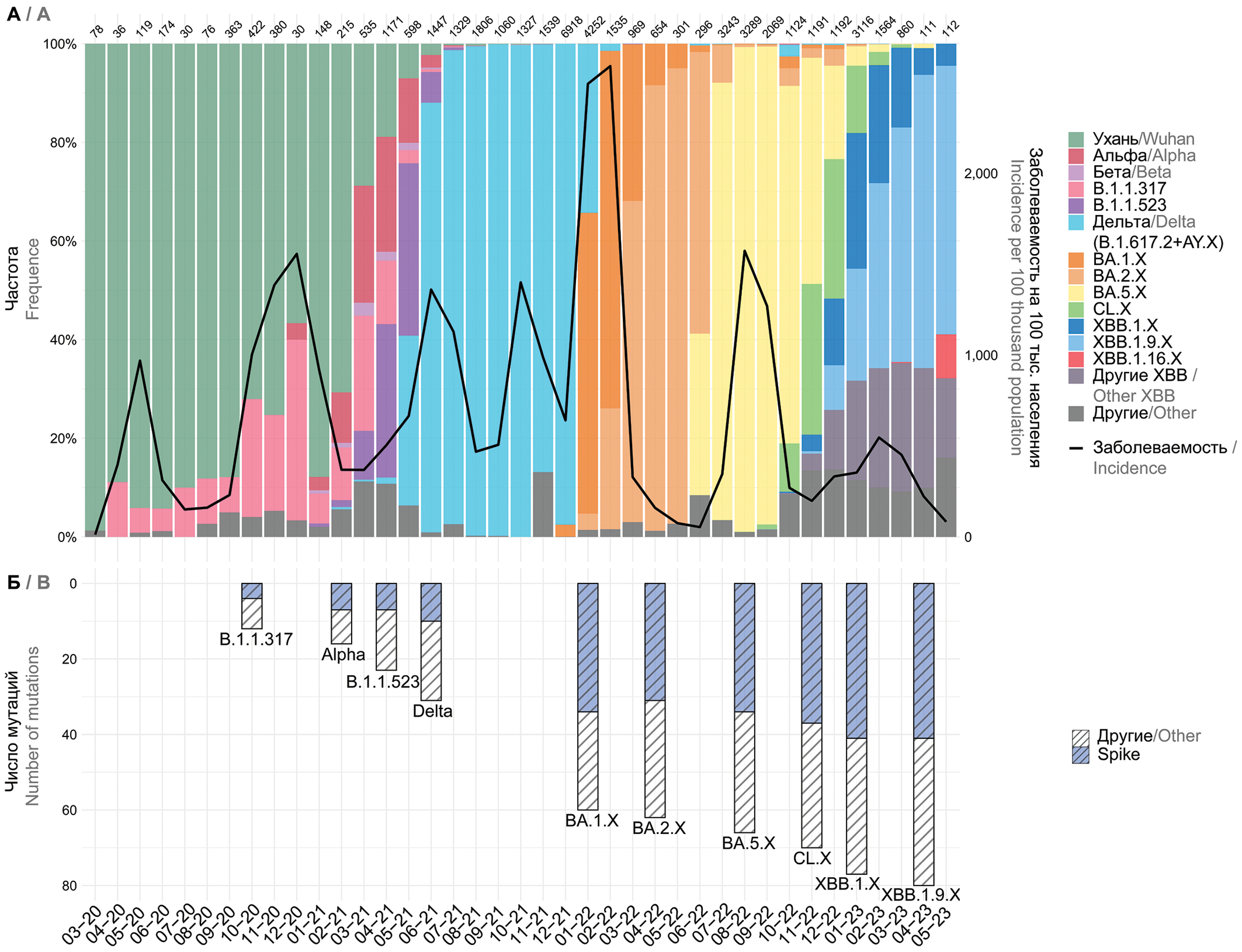 Рис. 1. Генетические варианты SARS-CoV-2, циркулировавшие в Москве с начала пандемии COVID-19. a – динамика генетических вариантов SARS-CoV-2. Слева по оси ординат показана доля генетических линий, справа – число новых случаев COVID-19 на 100 тыс. населения; б – изменение количества мутаций в основных циркулировавших вариантах SARS-CoV-2. По оси ординат показано количество мутаций. На оси абсцисс отражены периоды (месяцы).