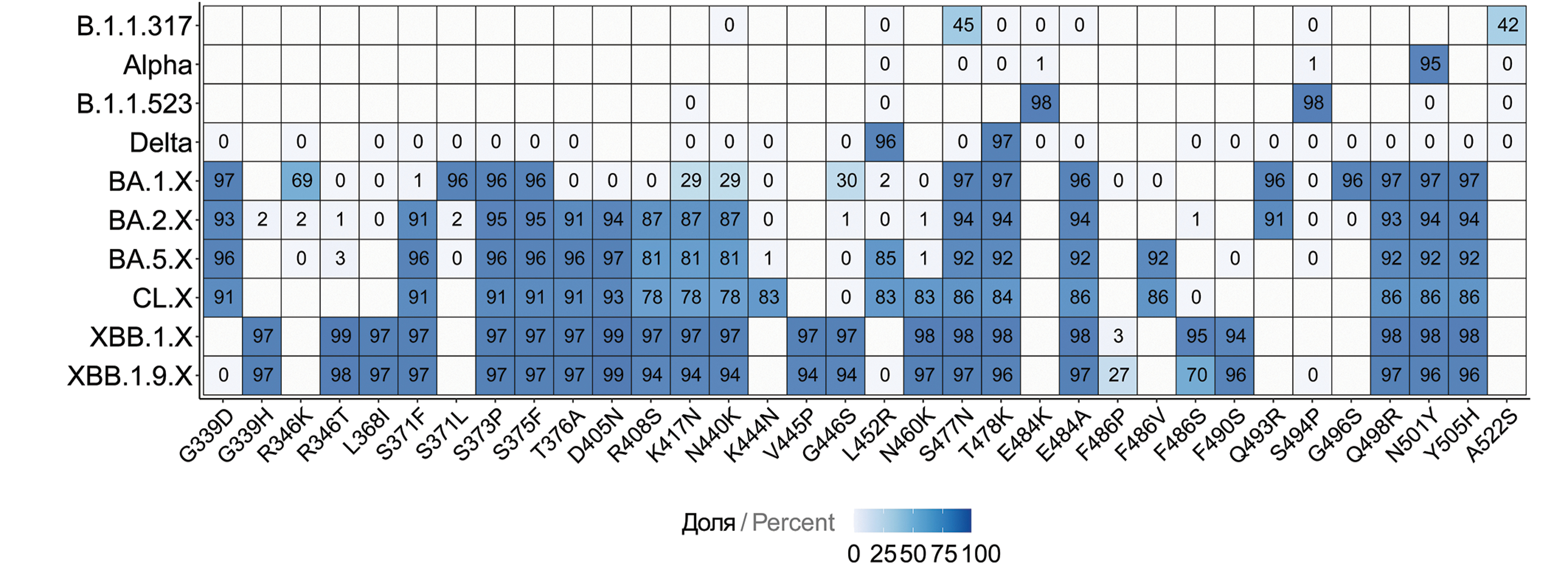 A detailed review of mutations in the selected variants revealed a characteristic mutation profile for the SARS-CoV-2 variants circulating in Moscow. In the RBD of the S-protein, the N501Y mutation was observed for Alpha, E484K and S494P for B.1.1.523. Delta was characterized by two amino acid substitutions (L452R and T478K) in the RBD of the S-protein, and 13 for BA.1.X, and the occurrence of the K417N, N440K, and G446S mutations in some genetic lineages related to this Omicron variant was also observed. The BA.2.X variant is notable for 16 mutations in the RBD, of which only 10 are common with BA.1.X; the dominating variants do not exhibit the R346K and S371L mutations present in BA1.X, and, furthermore, a series of additional substitutions appeared, including S371F, T376A, D405N, R408S, K417N, and N440K. The variants BA.5.X and CL.X had the L452R mutation characteristic of the Delta lineage and F486V, and all further circulating variants were also characterized by amino acid substitutions at position 486. From the end of 2022, the dominant genetic lineage in Moscow was XBB and its subvariants (Fig. 1) with a characteristic minimum of 22 amino acid mutations in RBD, of which 6 were not found in previously circulating variants (Fig. 2). In spring 2023, the main circulating variant was XBB.1.9.X, namely XBB.1.9.1, characterized by the F486P substitution (Fig. 2).