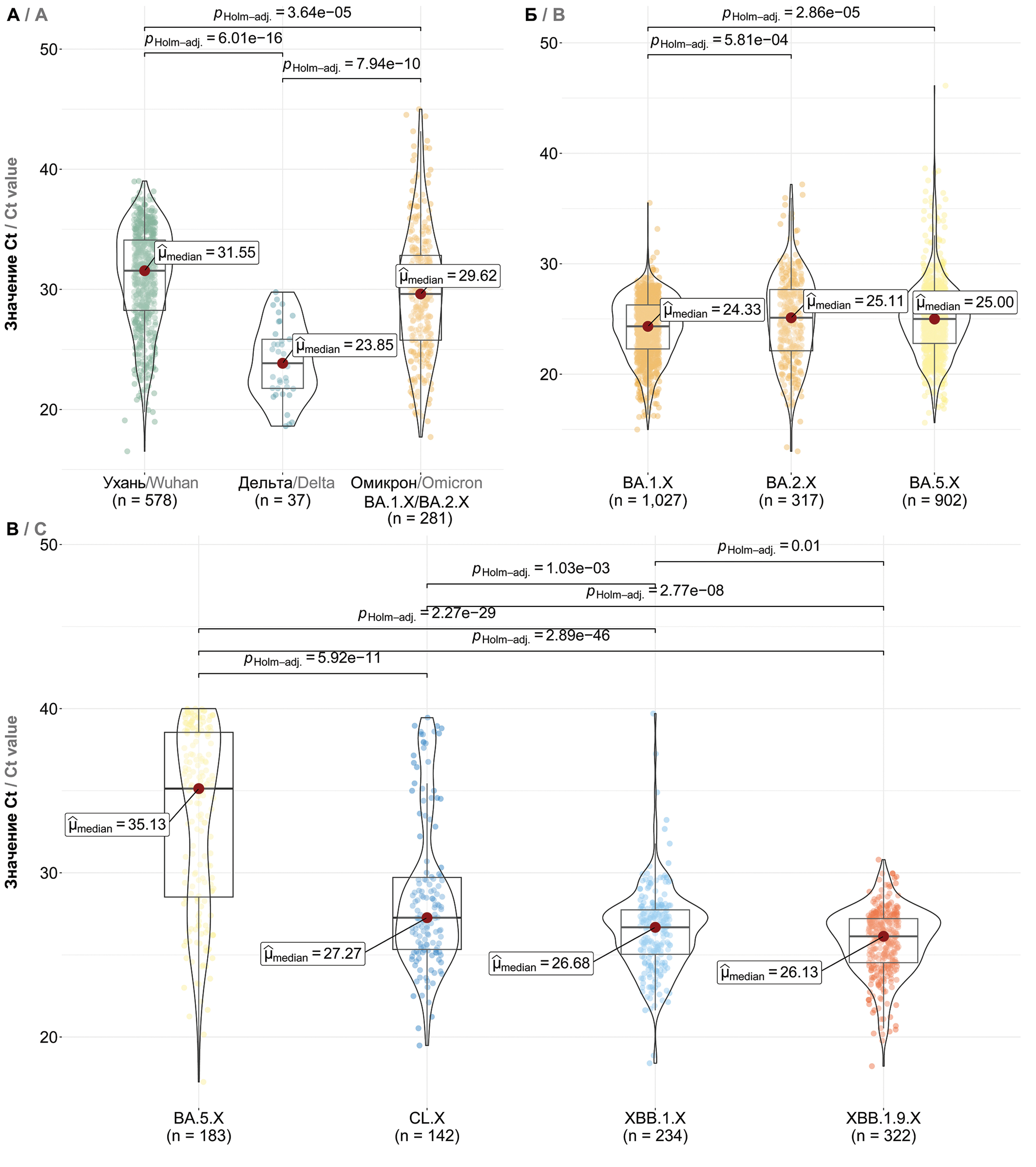 Рис. 3. Сравнение вирусной нагрузки основных доминировавших в Москве вариантов SARS-CoV-2. a – вирусная нагрузка вариантов Ухань (B.1.X), Дельта (B.1.617.2 + AY.X) и Омикрон (BA.1/BA.2.X); б – вирусная нагрузка вариантов Омикрон BA.1.X, BA.2.X и BA.5.X; в – вирусная нагрузка вариантов BA.5.X, CL.X, XBB.1.X и XBB.1.9.X. По оси ординат отражены значения Ct, по оси абсцисс – варианты SARS-CoV-2 и количество образцов.