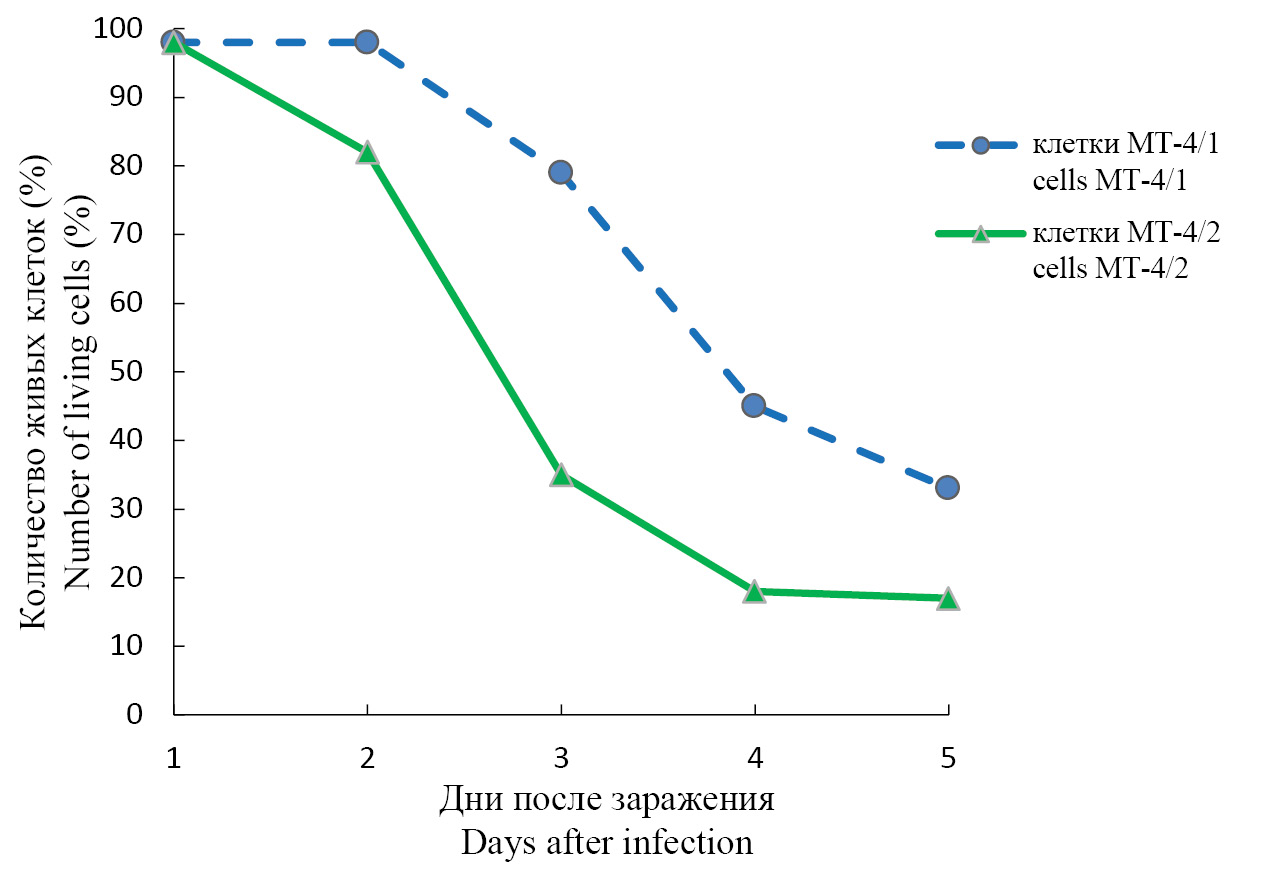 When two variants of the MT-4/1 and MT-4/2 cell lines were infected with HIV-1 strains IIIB, 899A, NOV and MS1974, it was observed under a light microscope that the infectious process in the MT-4/2 line developed significantly more actively. A pronounced cytopathic effect was observed for all listed virus strains, exceeding the similar effect in the MT-4/1 line. The results of infectious titer determination showed that for strain 899A it increased by about 4 orders of magnitude, IIIB – by about 3 orders of magnitude, NOV and MC1974 – by about 1 order of magnitude. Subsequently, strain 899A was chosen for cell infection as the most highly productive and most frequently used in our work. The results of cell viability during 899A virus replication at different time points after infection are presented in Fig. 1. It can be seen that the number of live cells in the MT-4/2 line already on the 2nd day after infection was significantly lower than in MT-4/1. On the 5th day the cytopathic activity of the virus in MT-4/2 line was about 20% higher.