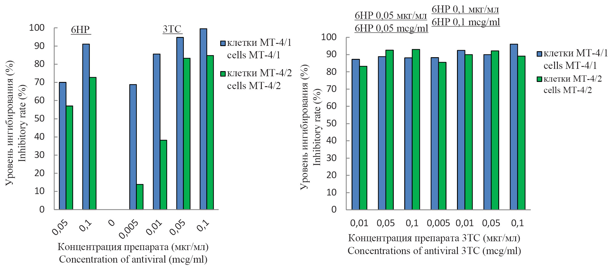Рис. 2. Подавление репликации ВИЧ-1/899А в линии клеток МТ-4/1 и МТ-4/2 препаратами 6НР и 3ТС.