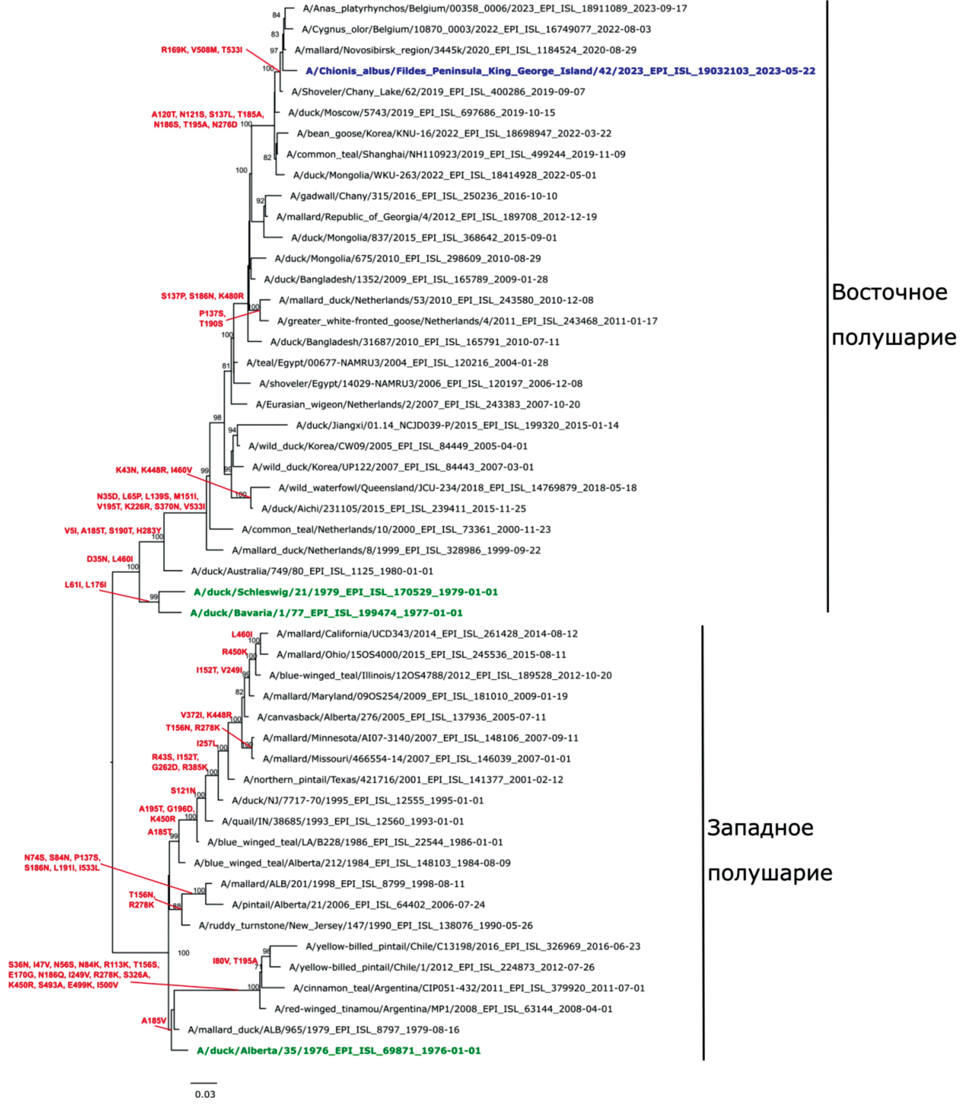 Homology of sequenced isolate A/Pygoscelis papua/Fildes Peninsula, King George Island/31/2023 (H3N8) by the neuraminidase gene ranged from 96‒97% relative to isolates from wild waterfowl of Asian Russia A/common teal/Novosibirsk region/3556k/2020 (H3N8), Mongolia A/duck/Mongolia/WKU-42/2022 (H3N8) and European strains such as: A/duck/Chernogolovka/5897/2021(H3N8), A/Anas_platyrhynchos/Belgium/2987_0001/2021(H3N8), A/mallard/Germany-BB/2023AI07658/2023(H3N8). The maximum difference was observed between the studied isolate and A/duck/Bangladesh/19D2073/2023 (H3N8) strain (Fig. 4).