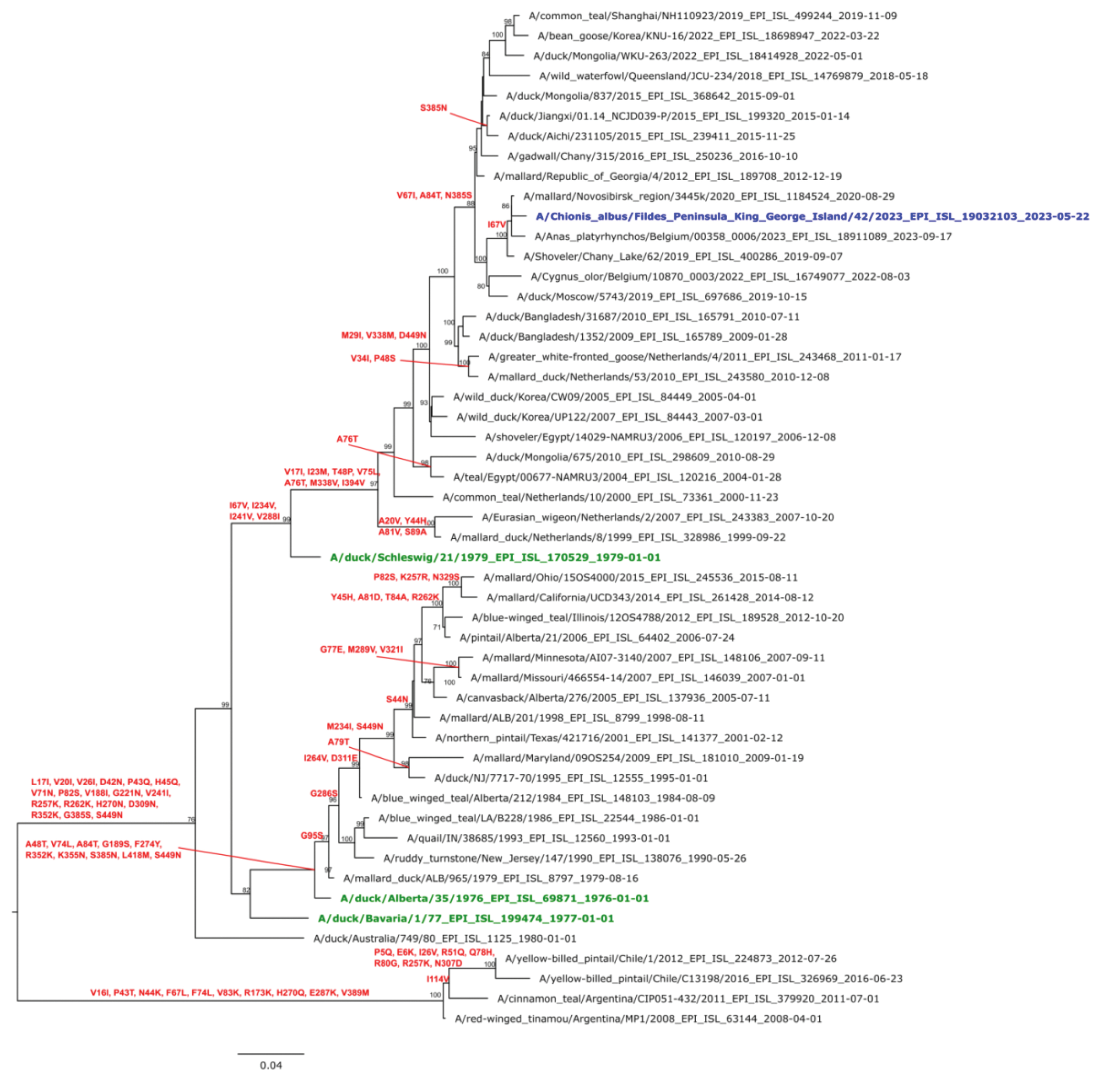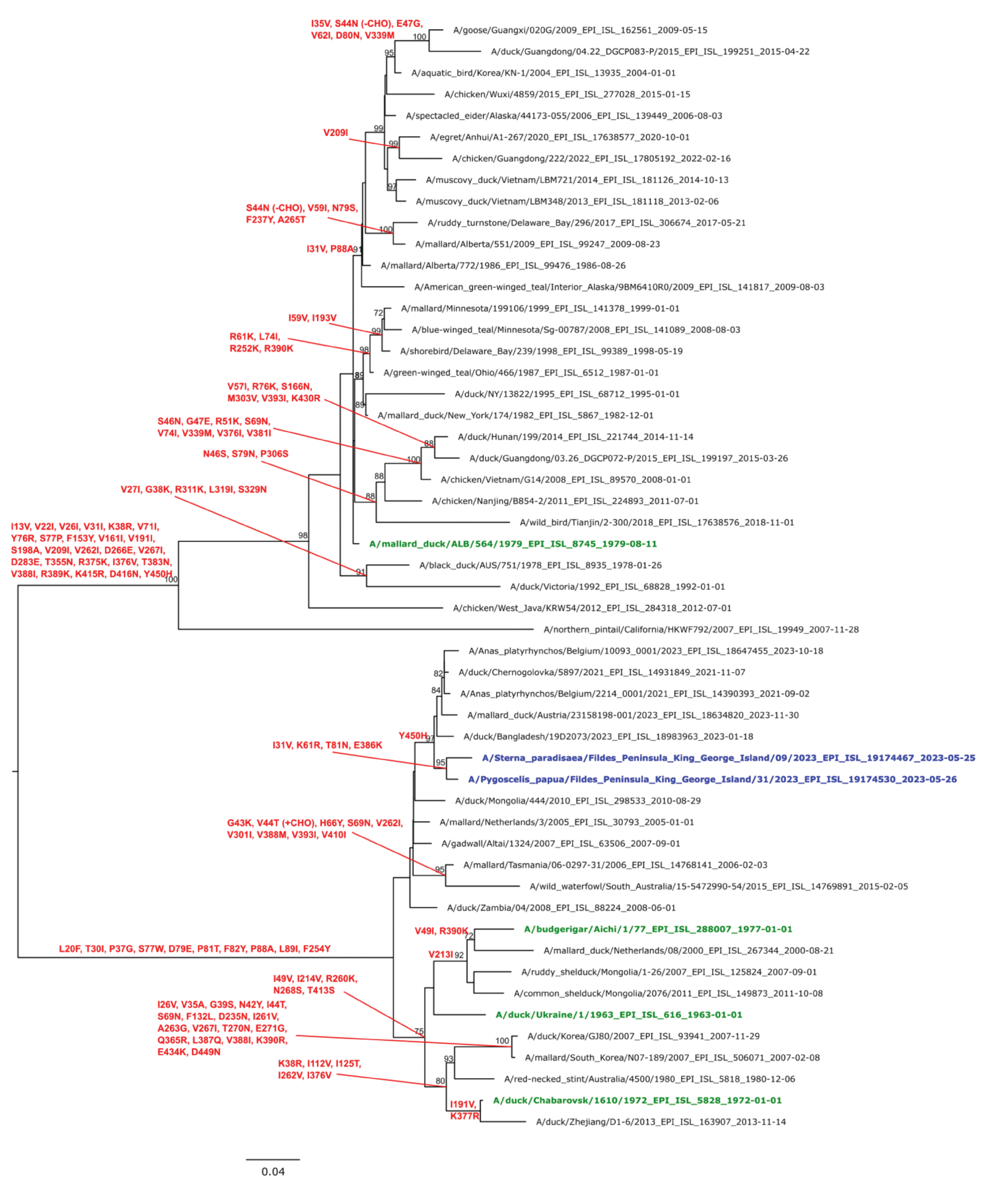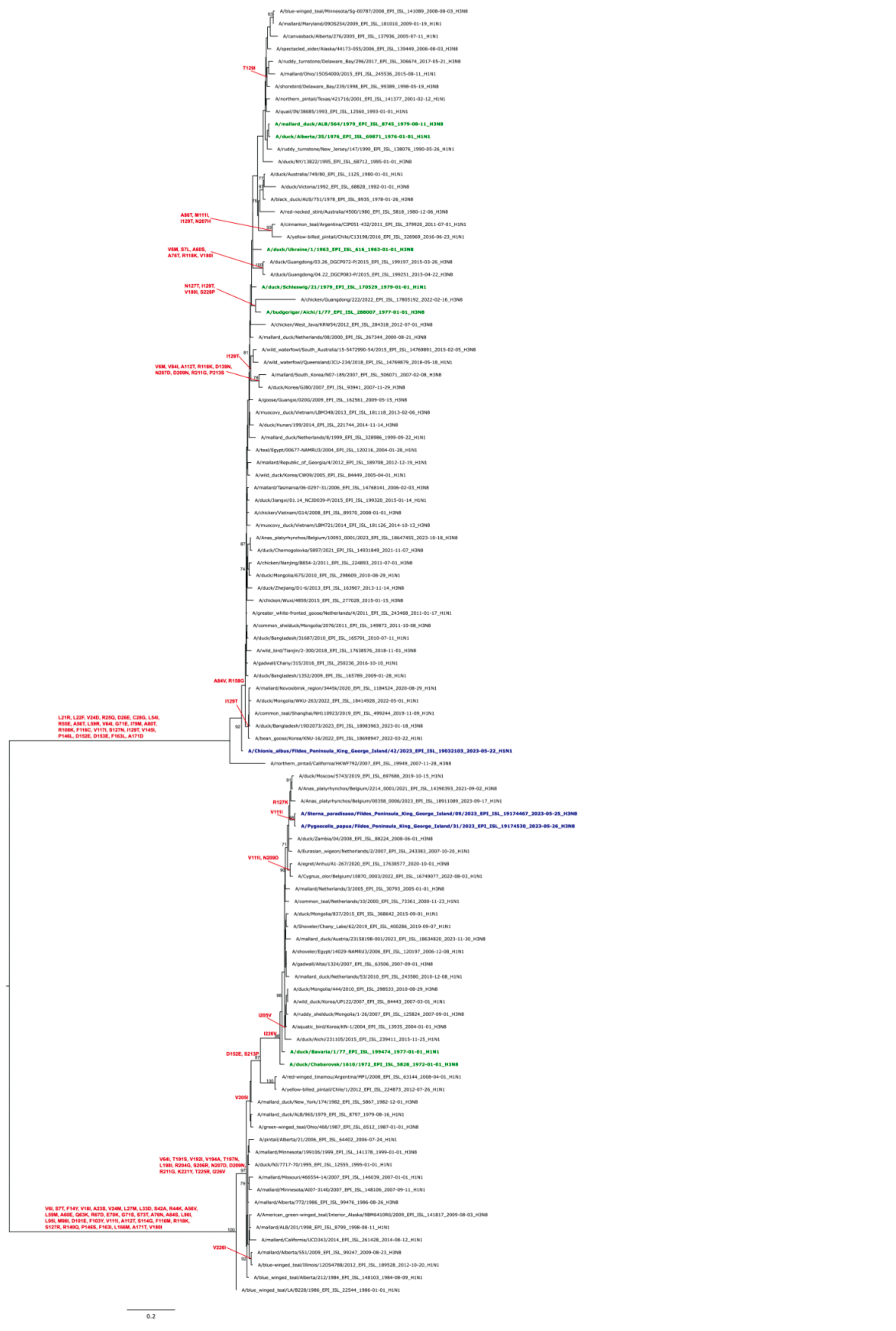 For the A/Pygoscelis papua/Fildes Peninsula, King George Island/31/2023 (H3N8) isolate, the amino acid substitutions identified were proline at position 226, Q226P and tyrosine at 228 (G228T). Correspondingly for the isolate A/Sterna paradisaea/Fildes Peninsula, King George Island/09/2023 (H3N8): proline at position 226, Q226P and histidine at 228, G228H.