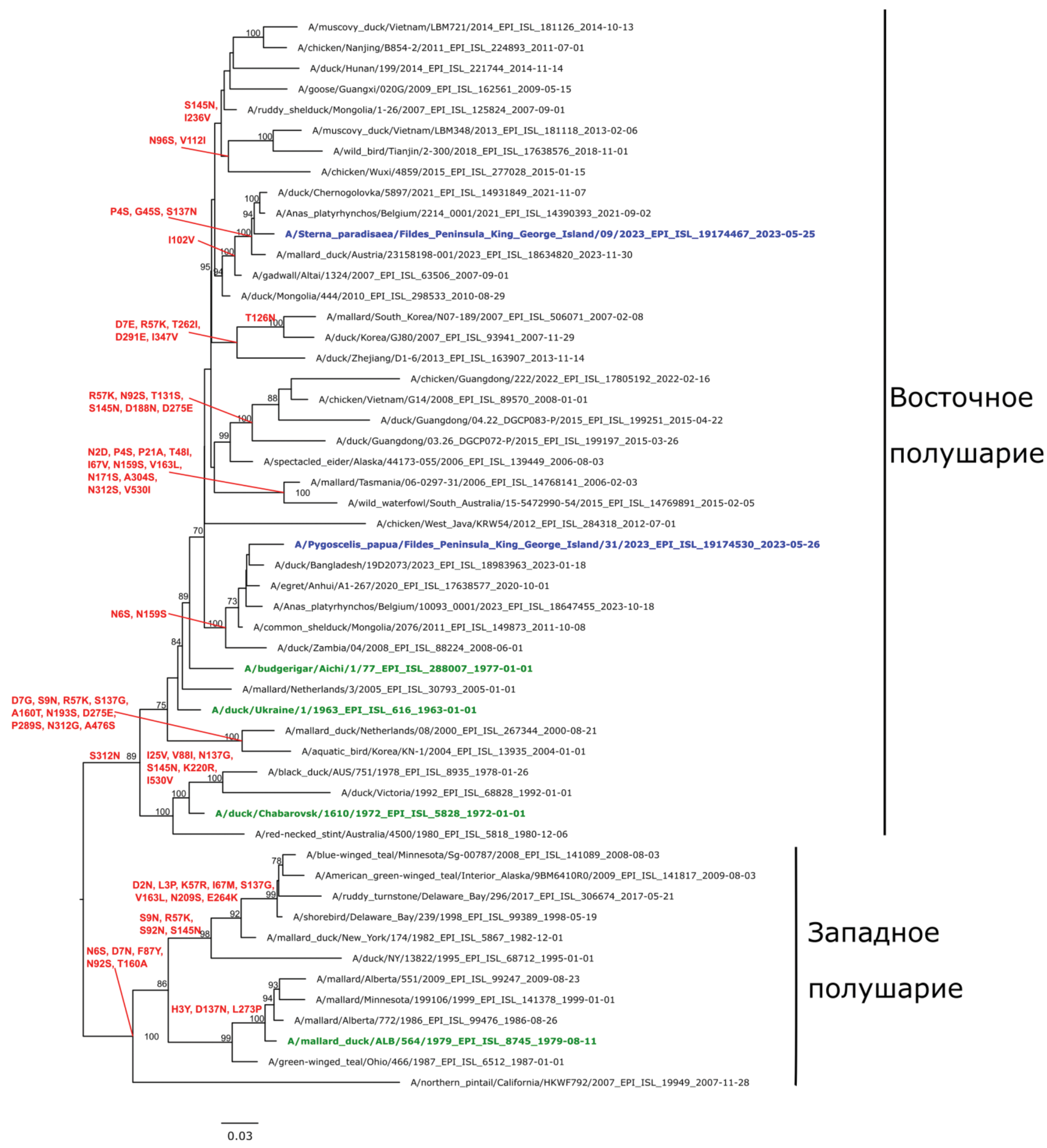 Thus, the results of this study demonstrated that the identified isolates were most likely the result of reassortment between European (Belgium, Netherlands, Russia) and Asian (Mongolia, China, Bangladesh) strains. A significant contribution to the formation of reassortants was caused by influenza A isolates circulating in the period 2018–2023, in the territory of the Asian part of Russia in wild waterfowl; this may indirectly indicate multiple introductions of different pathogen subtypes from the territory of the Asian part of Russia to the territory of Antarctica, with genetic variants circulating at the current time in Europe and Asia in wild bird populations.