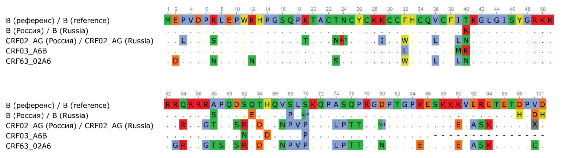 Рис. 1. Множественное выравнивание консенсусных последовательностей полноразмерного белка Tat вариантов субтипа В и вариантов CRF02_AG, циркулирующих в России, и вариантов Crf03_A6B, CRF63_02A6 относительно консенсусной последовательности вариантов субтипа В, циркулирующих в мире (B референс).