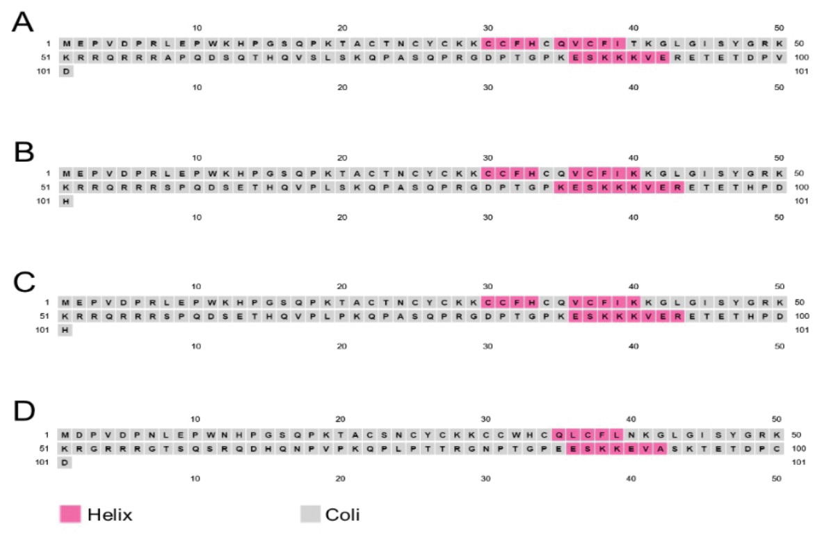 Since the consensus sequence of HIV-1 subtype B variants circulating in the Russian Federation was equally likely to contain serine (S) and proline (P) at position 70, two sequence variants were analyzed to predict the secondary structure of Tat protein: B(Russia)_v1/B(Russia)_v1 and B(Russia)_v2/B(Russia)_v2, respectively. The results of the structure analysis of the sequences under study are presented in Fig. 2.
