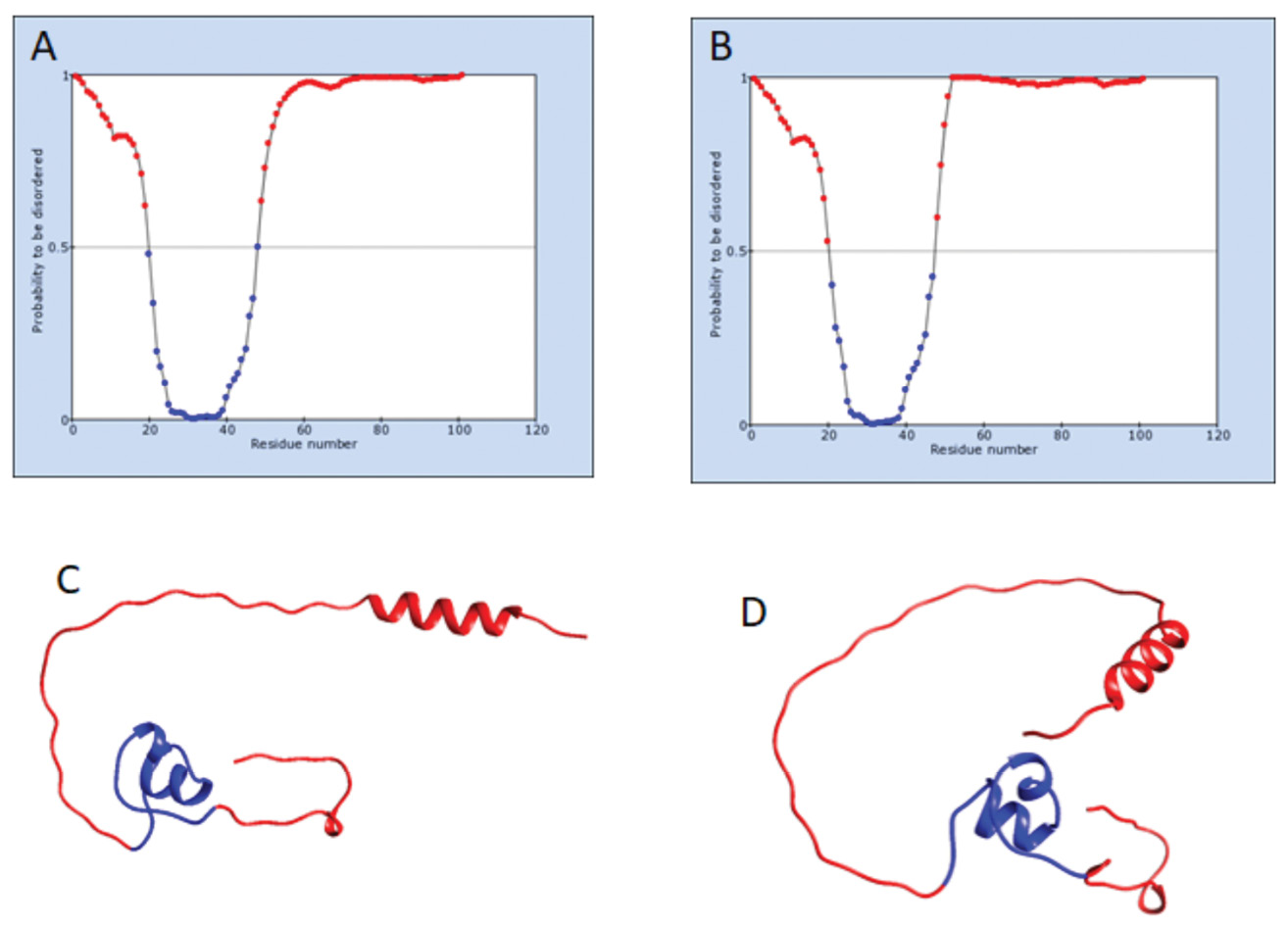 Probability profile for unstructured regions of Tat consensus sequences predicted by IsUnstruct: A – consensus sequence of HIV-1 subtype B variants circulating worldwide; B – consensus sequence of HIV-1 CRF63_02A6 variants. Spatial structure predicted by AlphaFold 2 for Tat consensus sequences: C – consensus sequence of HIV-1 subtype B variants circulating worldwide; D – consensus sequence of HIV-1 CRF63_02A6 variants. The sequence profile corresponding to unstructured regions is marked in red.