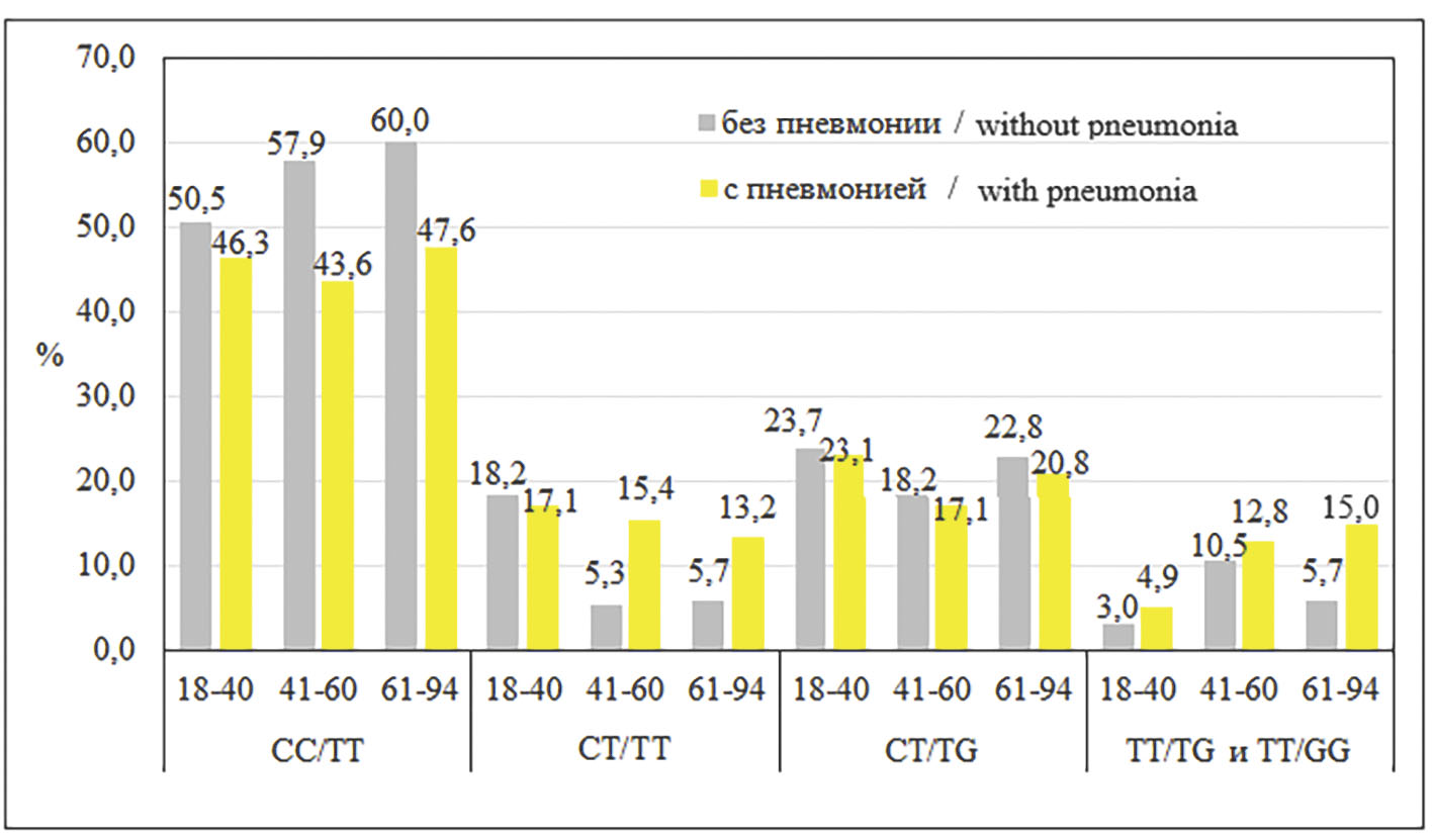 At the next stage of the study, another criterion was chosen: “with pneumonia” or “without pneumonia”, and genotypes of groups with moderate and severe course were compared. But beforehand, the influence of age on the development of pneumonia was evaluated. For this purpose, age subgroups were identified: 1) a subgroup consisting of patients 18‒40 years of age (n = 140), 2) 41‒60 years of age (n = 78), 3) 61‒94 years of age (n = 88). The Figure below shows the distribution of genotypes in the analyzed gene loci for all age subgroups of patients. It is visually noticeable that the CC/TT genotype is more frequently detected in individuals without pneumonia in all age subgroups. The emergence of the T allele changed the ratio of cases with and without pneumonia, the ST/TT genotype became more often detected in persons with pneumonia over 40 years of age. With the ST/TG genotype, the frequency of cases with and without pneumonia was very close. The frequencies of pneumonia detection at TT/TG, and TT/GG genotypes were close in the compared age subgroups.