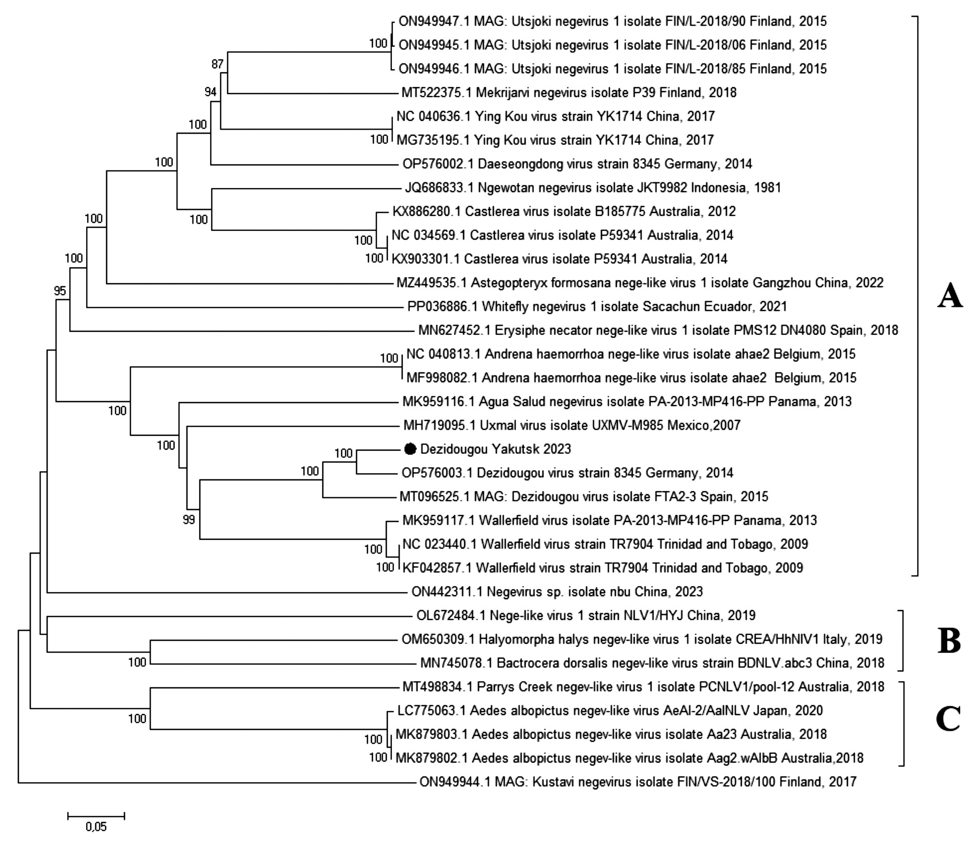 Fig. 3 shows the phylogenetic tree with our isolated DEZV Yakutsk 2023 and negeviruses. The closest to DEZV Yakutsk 2023 is the prototypical Dezidougou virus strain 8345 (OP576003.1) from Germany with an identity level of 91.95%. Among other negeviruses, the closest are viruses isolated in Finland (Utsjoki Negevirus 1, ON949947), Castlerea virus in Australia (KX886280) and Ying Kou virus in China (isolate NC 040636.1) with a similarity level of 72.1‒72.4% in nucleotide sequences.