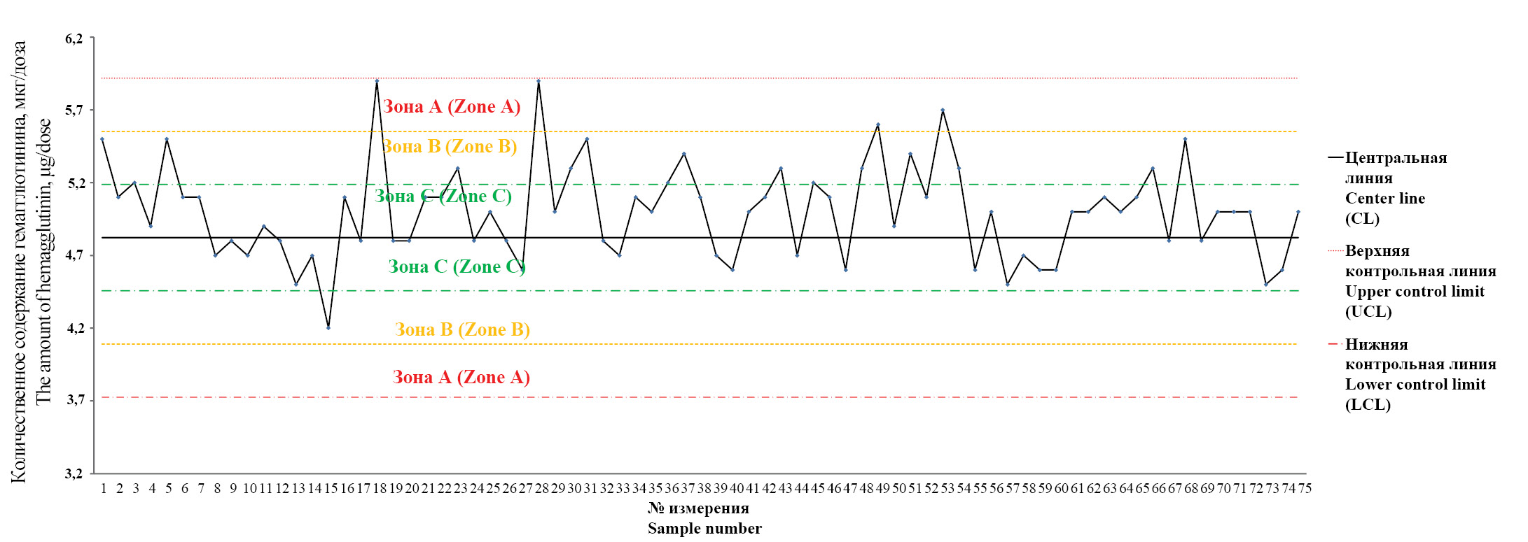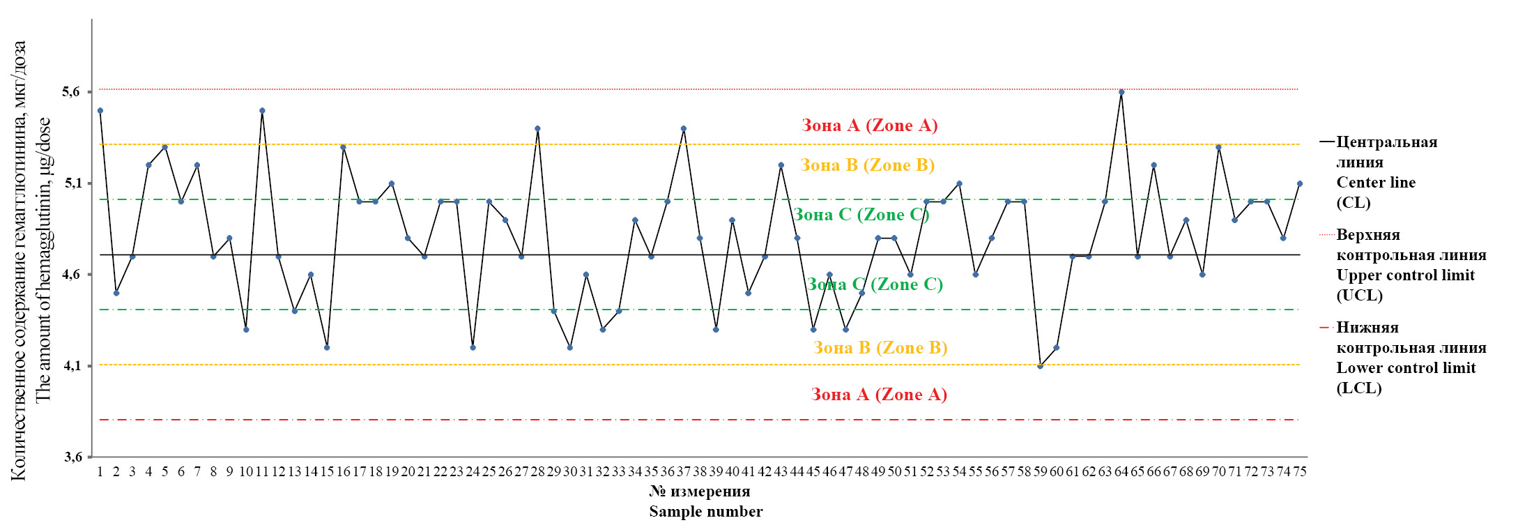 In Fig. 2, criteria signaling the action of special (external) causes are also absent. However, in 2 cases (measurements 18, 28) there is a tendency to form critical criterion 1: the measurements reach the value (5.9) set for the upper control limit, not going beyond zone A, but approaching the upper limit of the normative hemagglutinin content in the vaccine (6.0 µg hemagglutinin per dose).