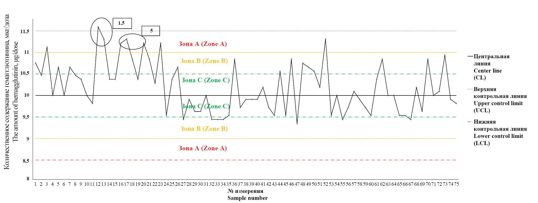 The Y-axis of each graph shows the values of hemagglutinin content in micrograms per 1 dose of the final lot (µg/dose), while the X-axis shows the number of measurements. To analyze the obtained data, the central line (CL) corresponding to the average value of the obtained measurements and 3 additional lines on each side of the central line corresponding to the calculated values ±1σ, ±2σ, ±3σ (UCL – upper control line, LCL – lower control line) are drawn on each graph. The zones bounded by the center line and the lines ±1σ, ±2σ, ±3σ are labeled «zone C», «zone B», «zone A», respectively. In case of detection of the features corresponding to the criteria from the «Materials and Methods» section, the number of the criterion was indicated on the graph.