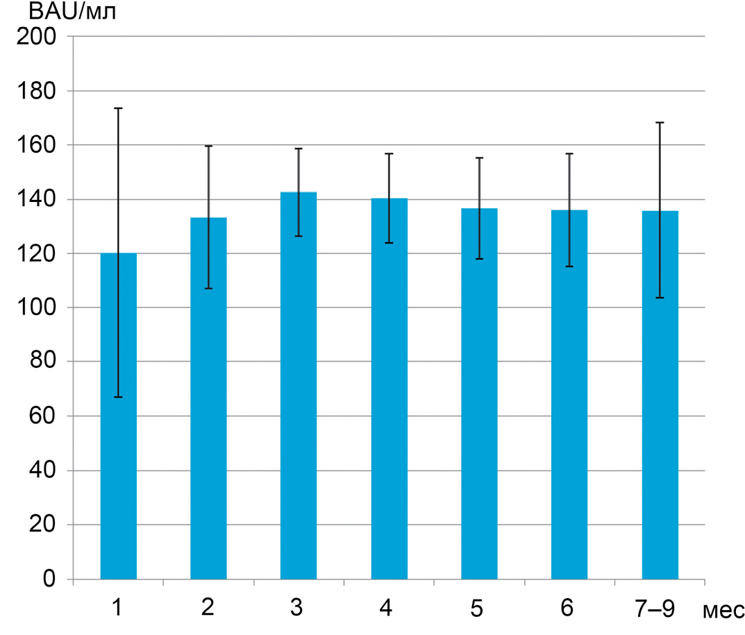 Среднее количество суммарных антител через 1, 2, 3, 4, 5, 6, 7–9 мес после перенесенного COVID-19, количественный метод, BAU/мл (N = 6, 23, 37, 38, 34, 17, 8).