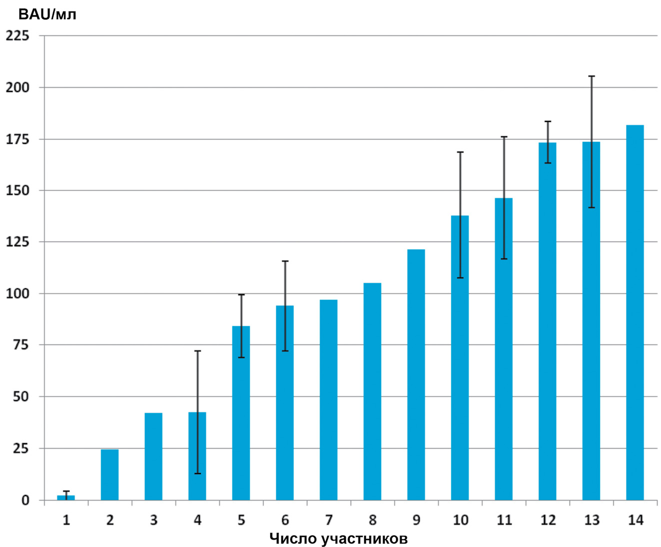 При возможности (более 3 измерений уровня антител) были рассчитаны средние значения и погрешности измерений. Участник № 1 имел отрицательный результат, у остальных участников исследования ‒ положительный результат.