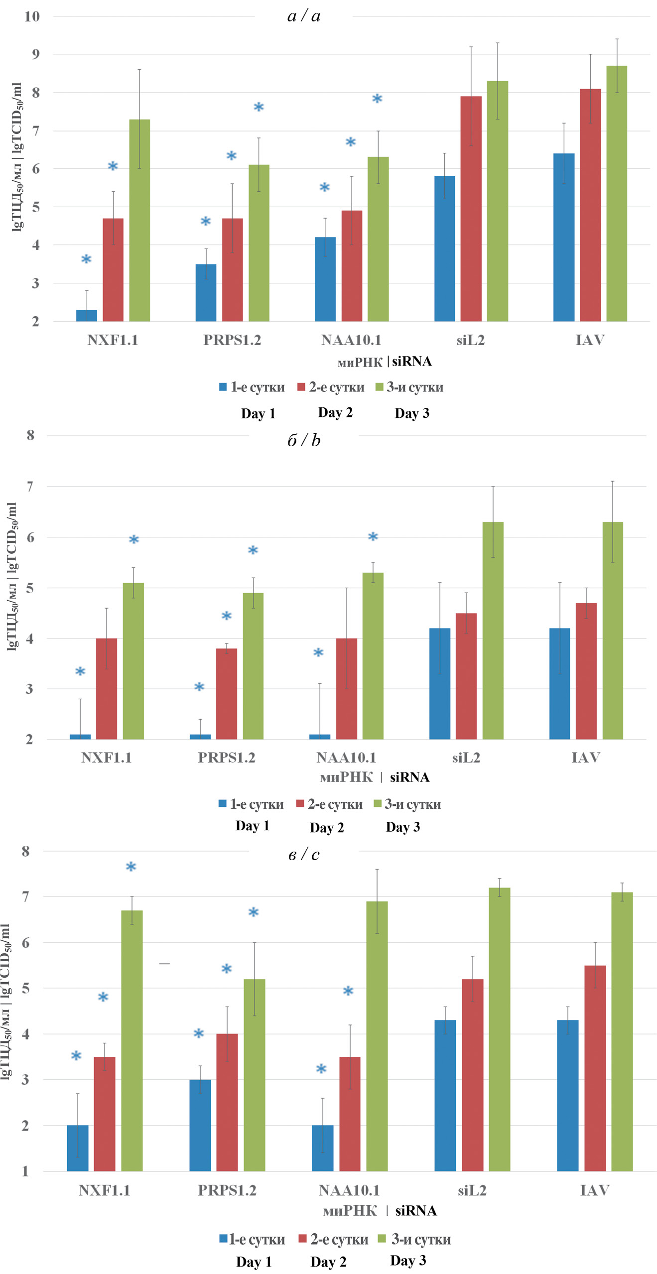 а ‒ A/California/7/09 (H1N1); б ‒ A/Brisbane/59/07 (H1N1); в ‒ A/WSN/1933 (H1N1). По оси абсцисс ‒ миРНК и их одноименные целевые клеточные гены; по оси ординат ‒ показатель вирусного титра lg ТЦД50/мл относительно вирусного и неспецифического контроля. * ‒ р < 0,05 относительно неспецифического контроля siL2.