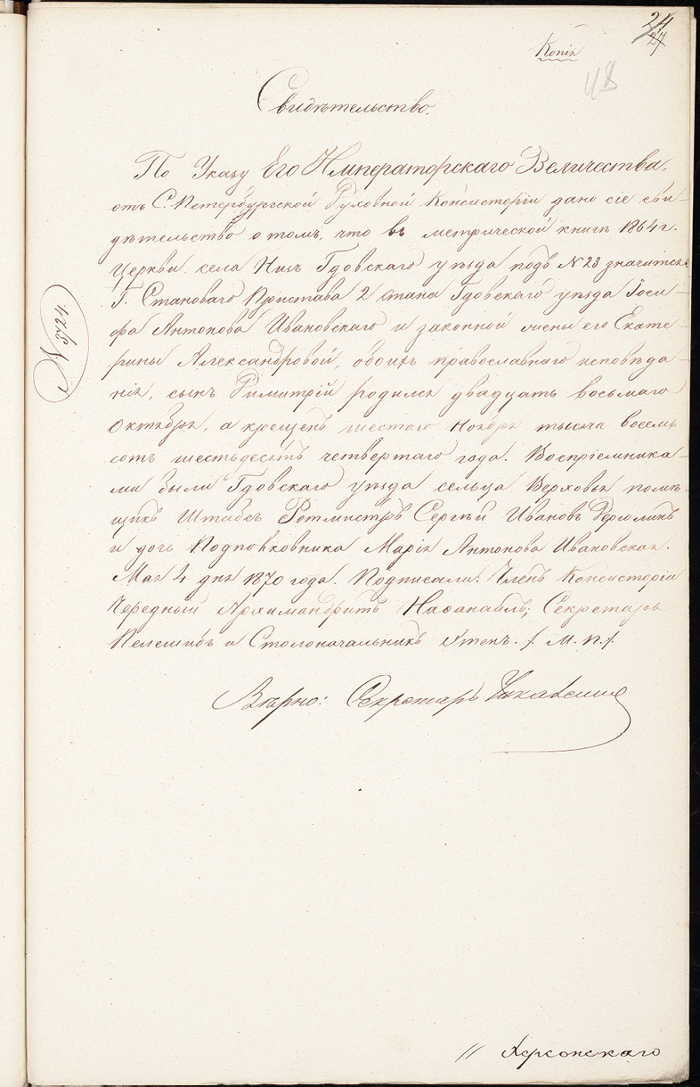 Свидетельство о рождении Д.И. Ивановского (РГИА, ф. 1343, оп. 22, д. 2719, л. 48).