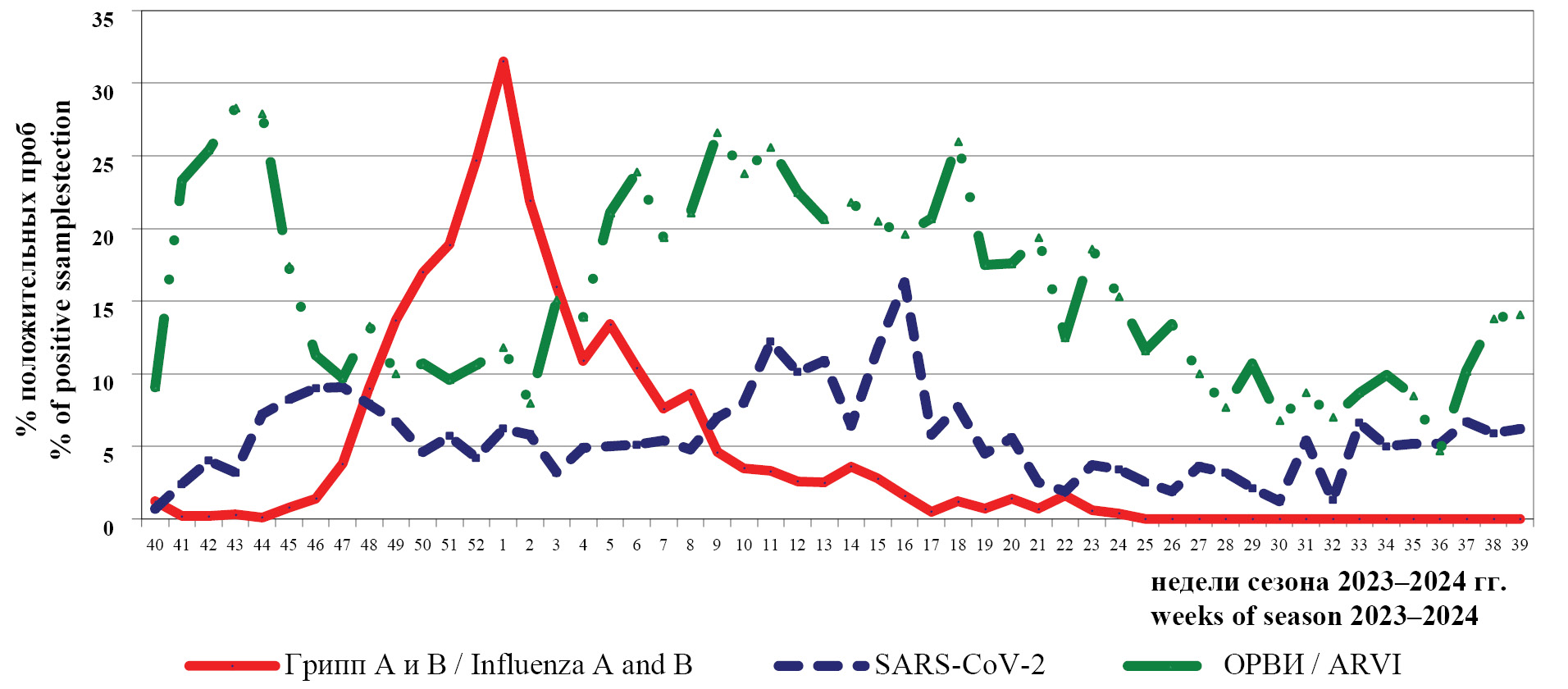 The epidemic season of 2023‒2024, as well as the previous one, started with high rates of positive samples for acute respiratory viruses of non-influenza etiology (28.3%). Against the background of decreasing activity of ARVI pathogens and relatively low frequency of positive samples for SARS-CoV-2 (up to 9.1%), there was an increase in the activity of influenza viruses with the maximum number of positive samples (31.5%) during the 1st week of 2024. These data indicate high epidemic activity of influenza viruses during this period and correlate with the incidence of ARVI.